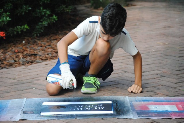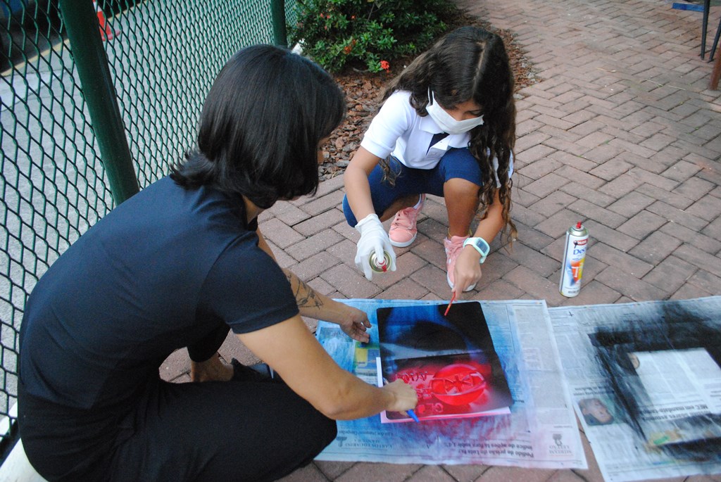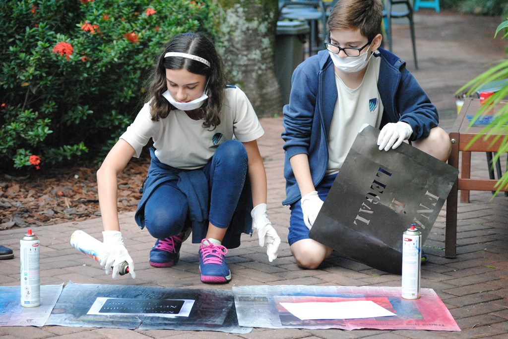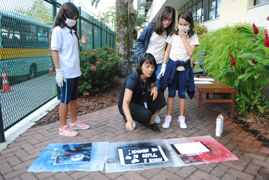 A arte de rua do veterano artista Banksy foi objeto de estudo nas aulas da professora de Arte Gabriela Veloso no 6º ano do Ensino Fundamental. Ativista político e dono de uma obra subversiva, carregada de conteúdo social, Banksy trabalha com a técnica do estêncil com tinta spray. Assim, depois de apresentar o artista, algumas de suas obras e promover um debate sobre elas, a professora convidou os alunos a desenvolverem um estêncil próprio, aos moldes da linguagem de Banksy.