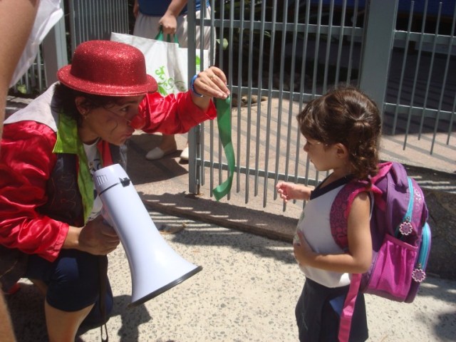 A volta às aulas é momento de rever os colegas de turma, as professoras, de retornar à rotina de estudos, abraçando novas ideias, novas descobertas e possibilidades. Por isso, a Equipe Pedagógica e a Equipe de Divulgação prepararam um acolhimento especial a pais e alunos no primeiro dia do ano letivo da Educação Infantil. Na porta da escola um personagem incorporado pela professora Lívia Moraes, o “Doador de laços e abraços”, recebia a todos com o poema “O Laço e o Abraço”, de Mário Quintana e uma fita, que deveria ser amarrada no mural de entrada.