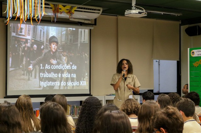 A aula contou com as considerações dos professores Júlia Passos, de História, que retratou o processo de urbanização e as condições de trabalho da Inglaterra do século XIX, Tigran Magnelli, de Produção Textual, que apresentou o nascimento do Realismo, suas implicações e influências sobre a obra, e Diego Veríssimo, de Língua Portuguesa, que aprofundou as percepções do texto.