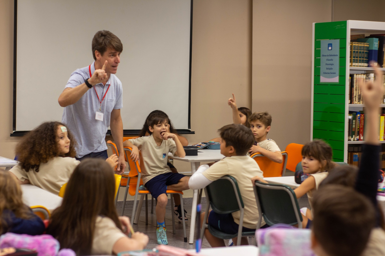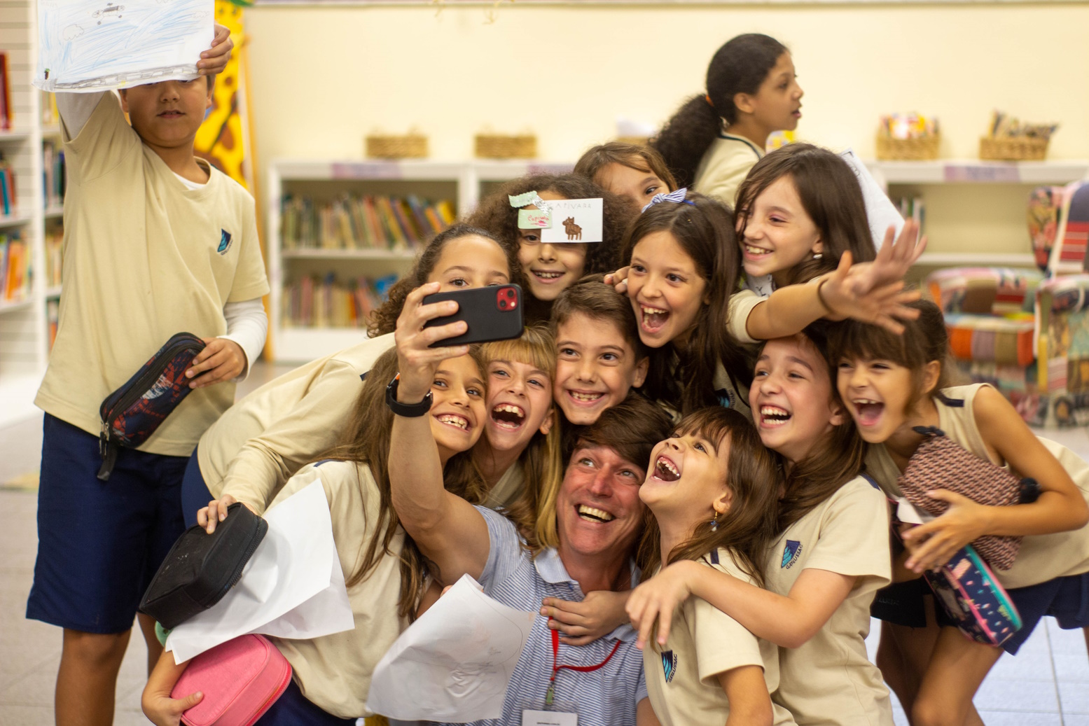 Já a turma 3T3 recebeu Luciano Paez, secretário do clima de Niterói, para um diálogo sobre o seu trabalho, bem como atitudes mais sustentáveis que podemos ter diariamente. Dentre eles, vir de bicicleta para a escola, hábito que incentivamos e que nos rendeu o selo “Amigo da Bicicleta” cedido pela Prefeitura em 2022. O encontro faz parte do Projeto Por Um Mundo Melhor deste ano e, ao fim, Luciano propôs que as crianças desenhassem uma “cidade do futuro”, com mais ciclovias e espaços verdes.