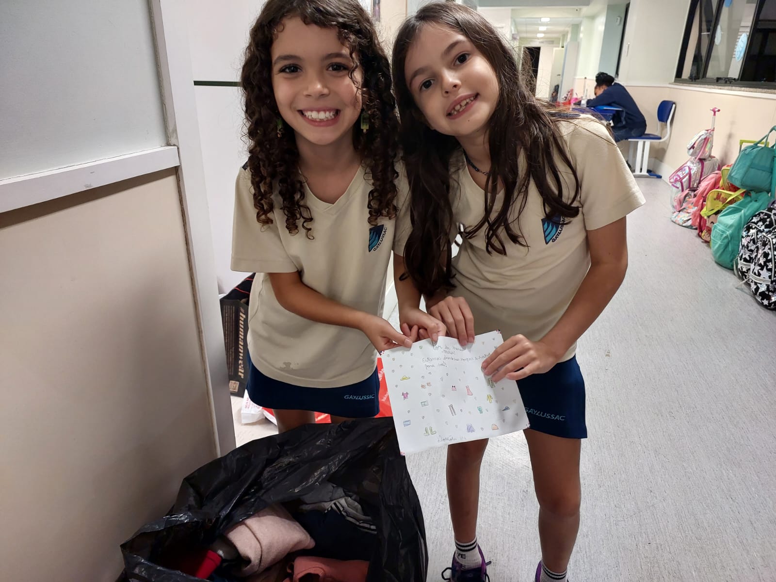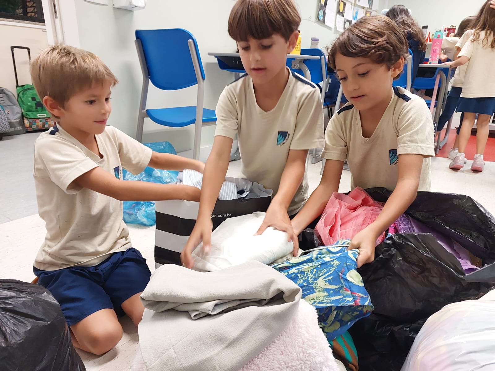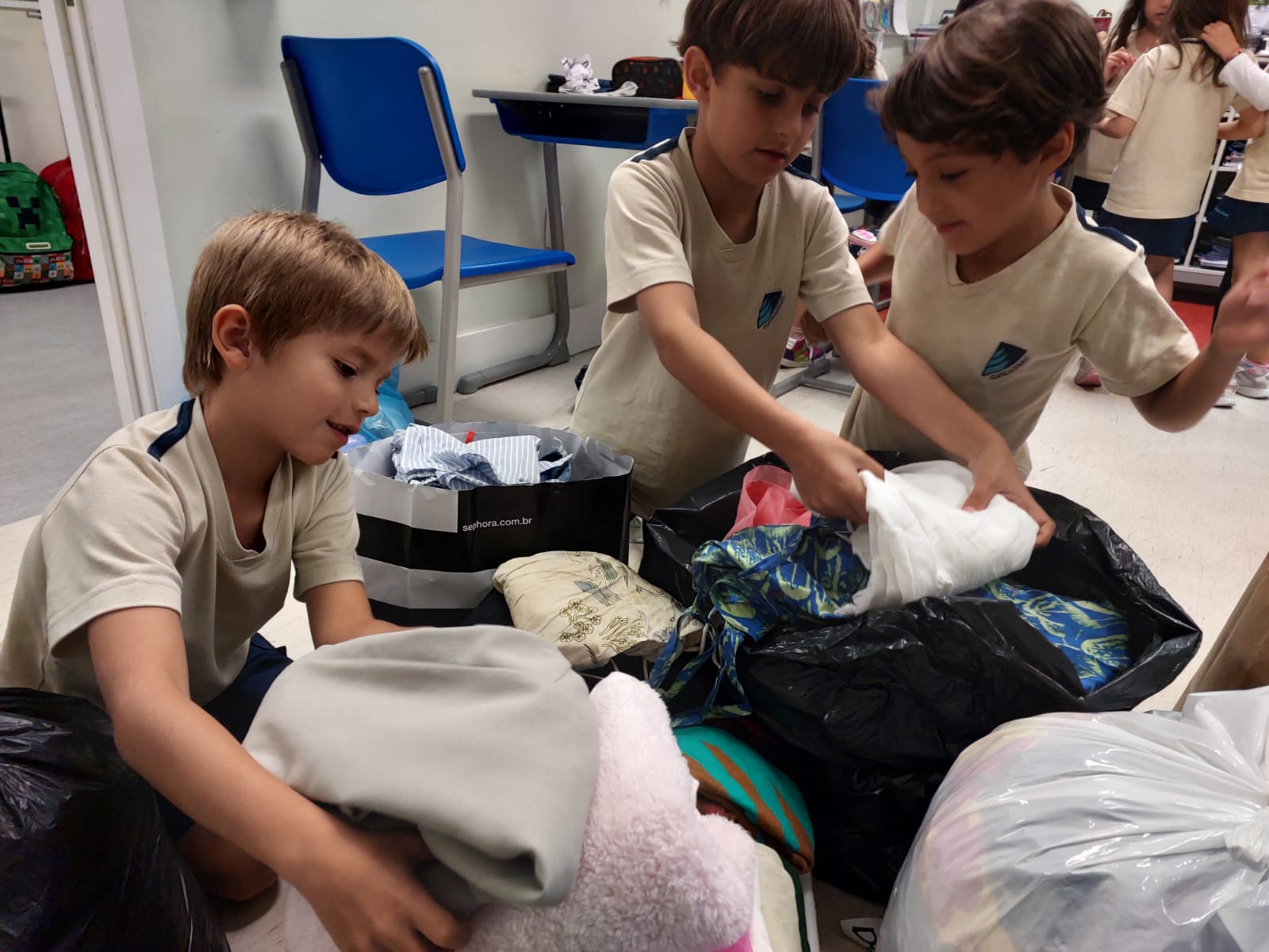 A professora Juliana Oliveira explica: “Arrecadamos roupas e sapatos, em bom estado, para doar ao projeto. As crianças passaram nas salas do primeiro 1° ano e do Grupo 5 divulgando a ação, recebemos doação de outras turmas e juntamos tudo isso, fizemos um mutirão com os alunos da turma, onde dobramos e embalamos as roupas. em cada pacote enviamos recadinhos produzidos pelas próprias crianças”.