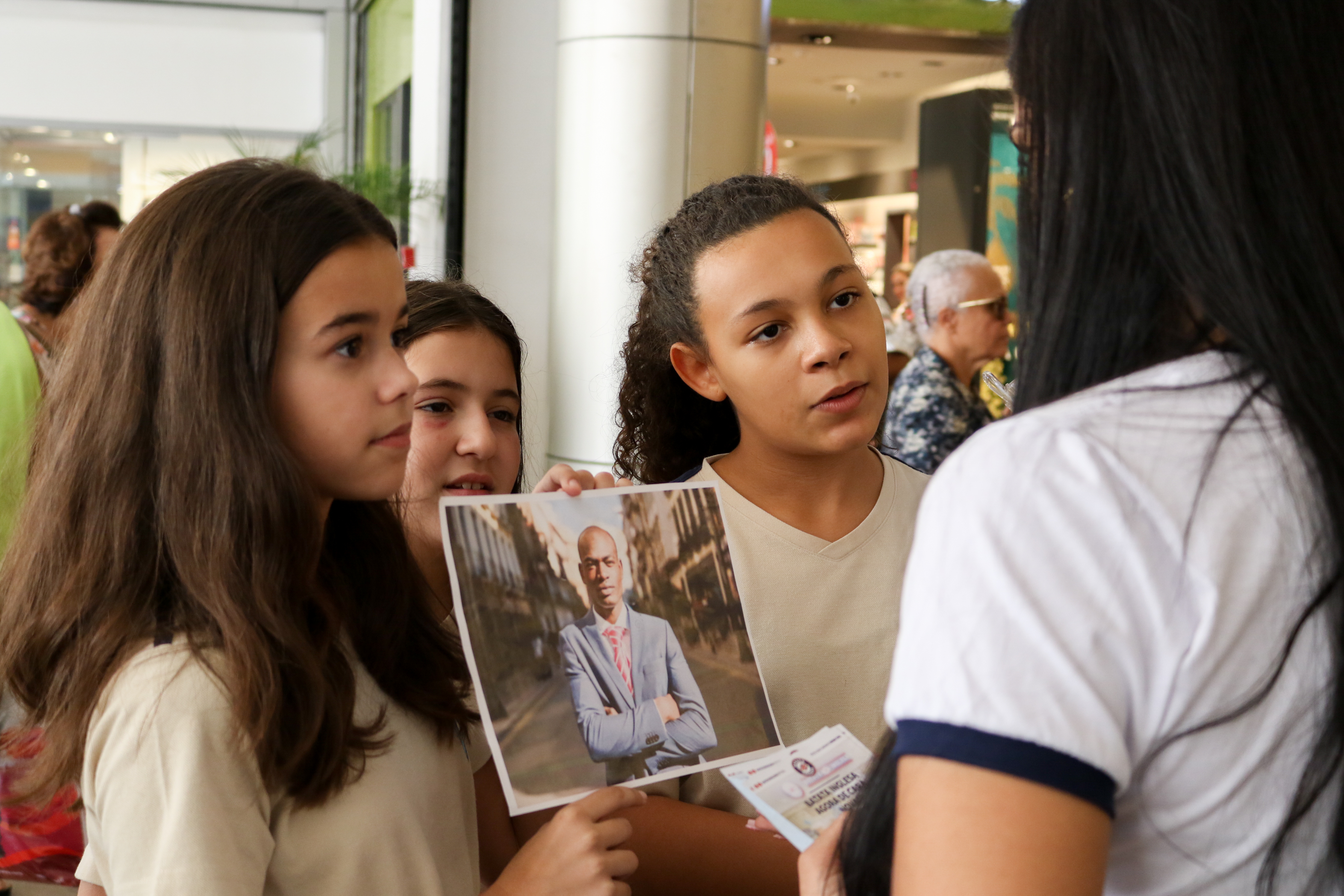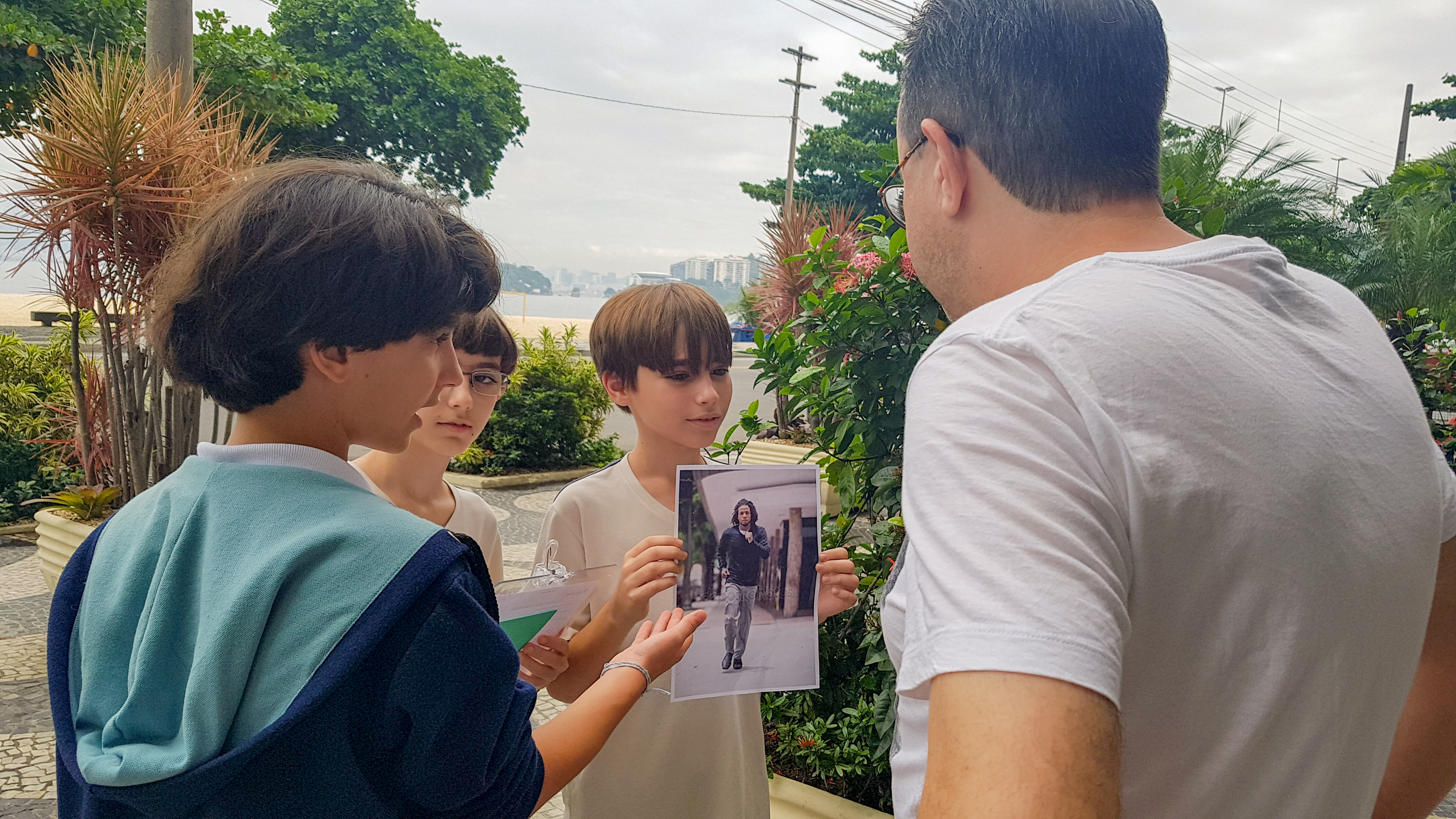 A proposta foi levar essa pesquisa a campo. Cada turma recebeu uma imagem, um questionário e a missão de fazer 10 entrevistas. Com prancheta na mão, os alunos visitaram vários locais de Niterói e colheram uma amostragem de mais de 400 entrevistas com uma pergunta bem aberta: “O que você vê nessa imagem?”. O objetivo era fazer um teste do racismo nos moldes da experiência do vídeo.