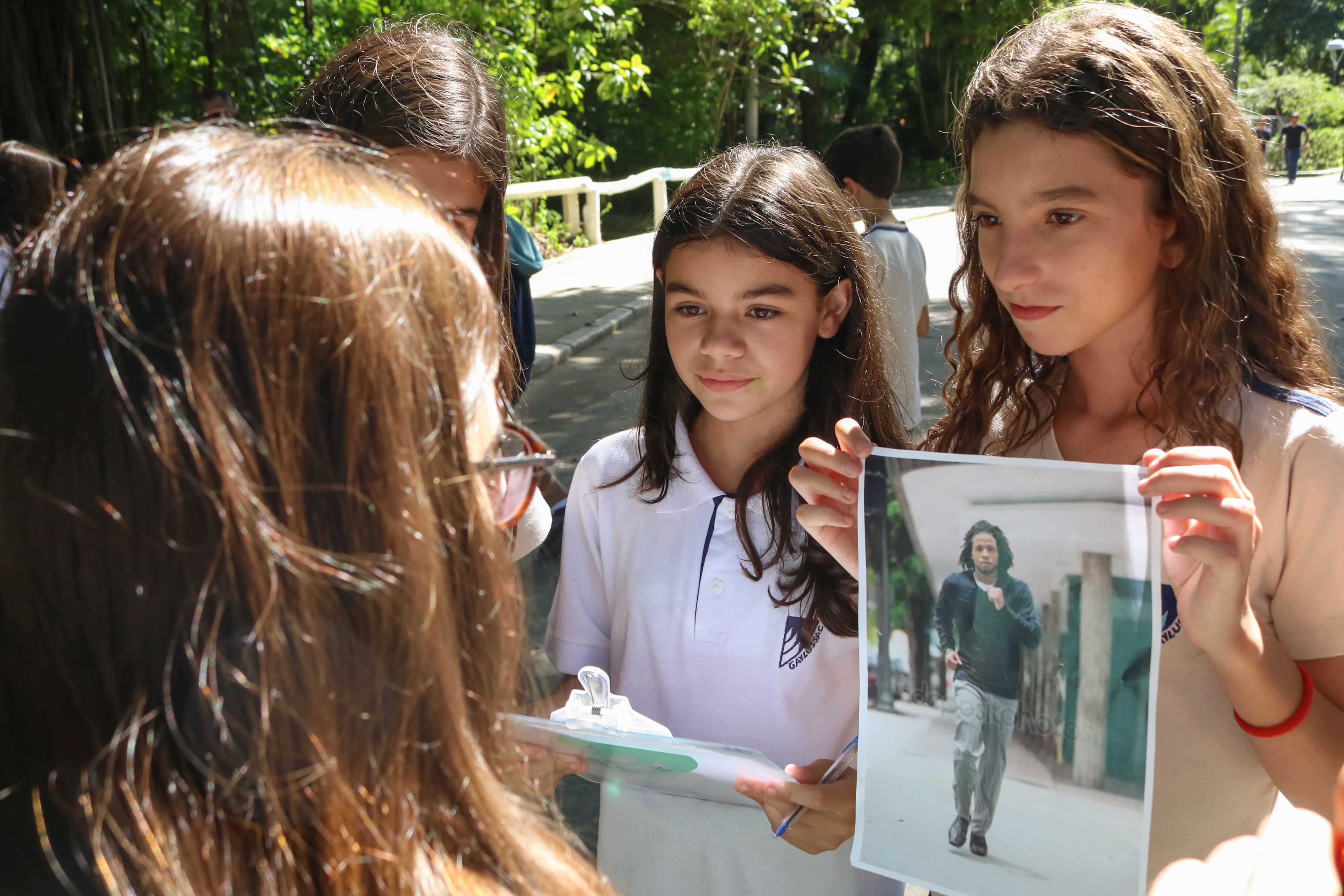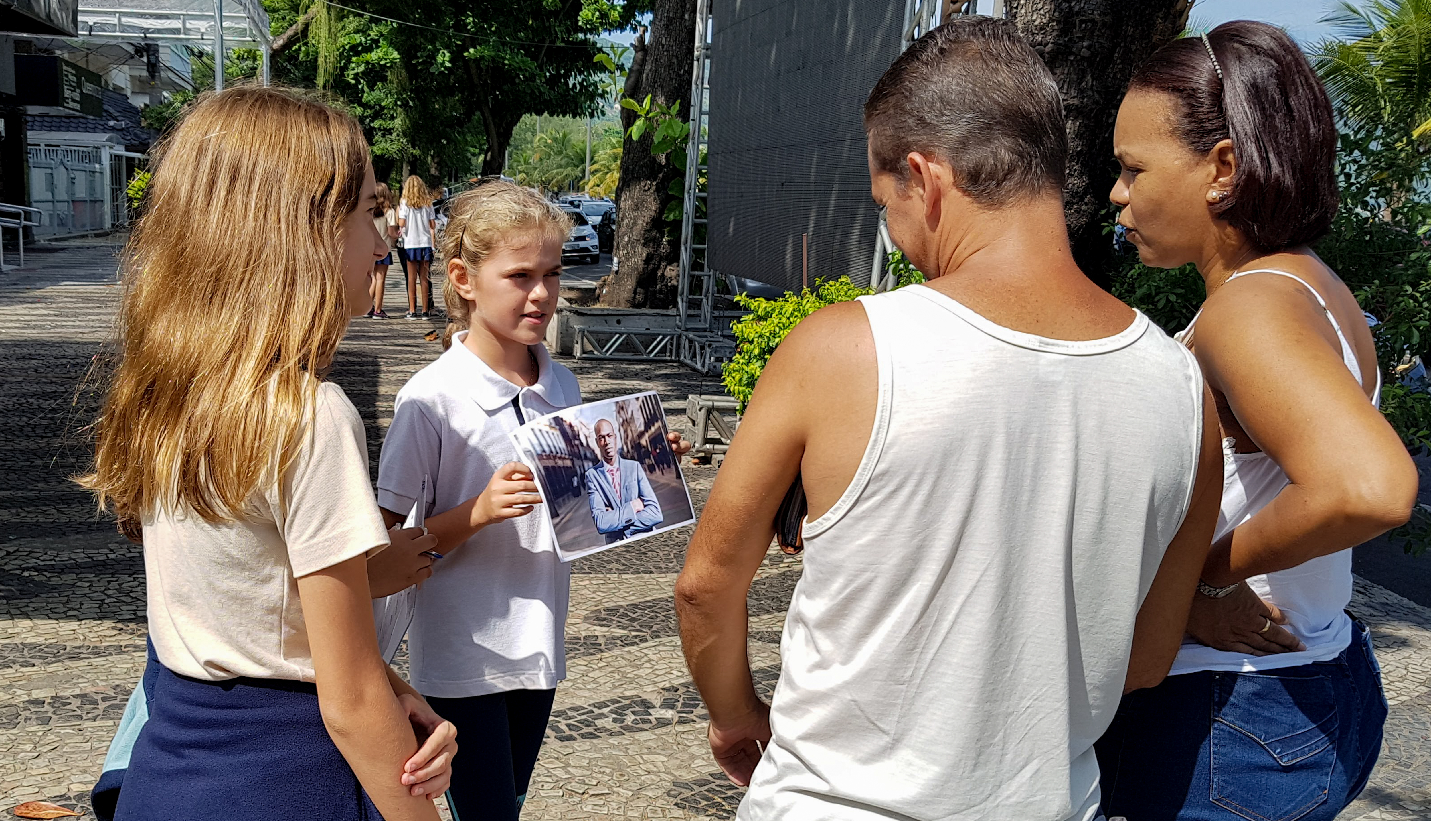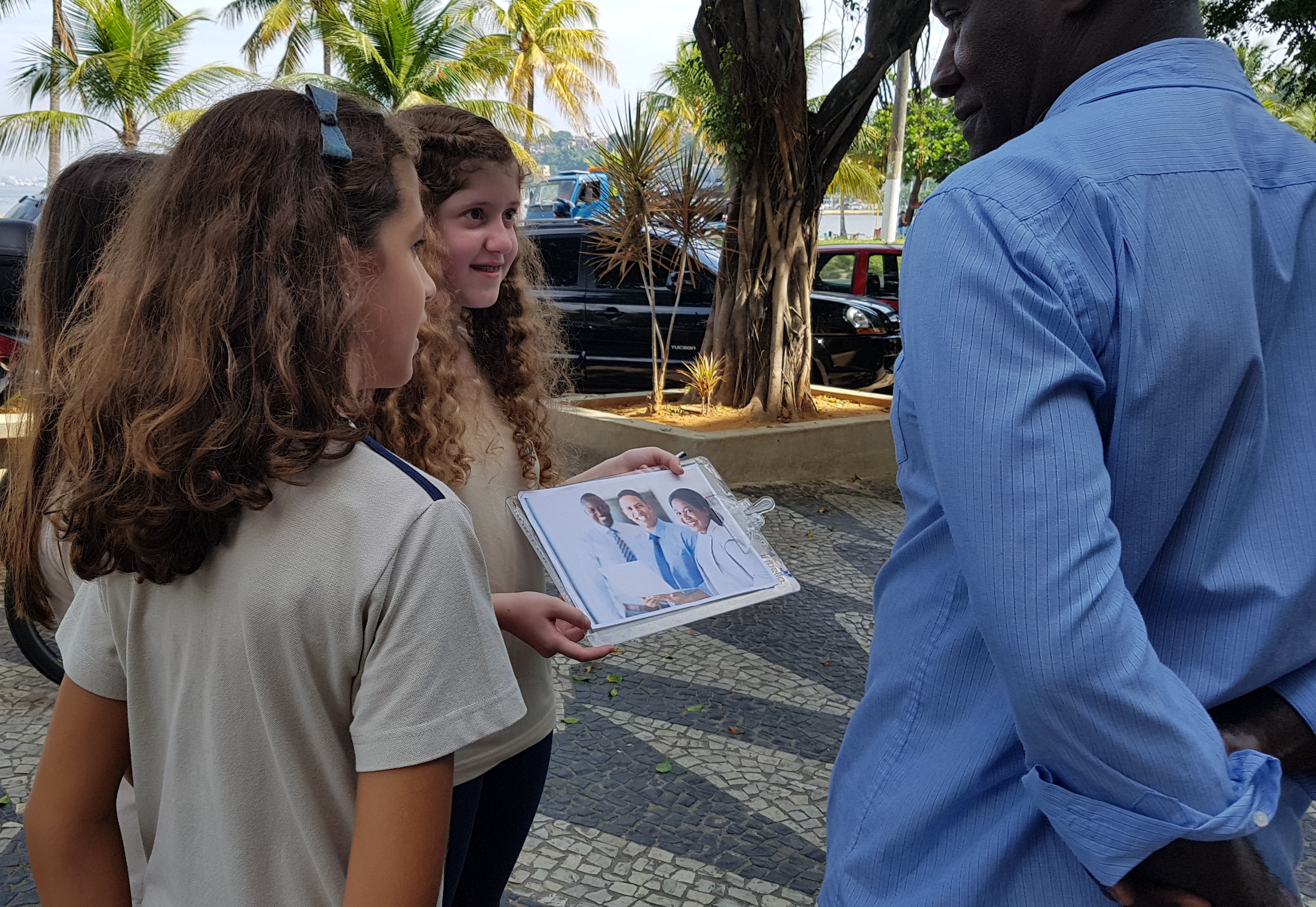 A proposta foi levar essa pesquisa a campo. Cada turma recebeu uma imagem, um questionário e a missão de fazer 10 entrevistas. Com prancheta na mão, os alunos visitaram vários locais de Niterói e colheram uma amostragem de mais de 400 entrevistas com uma pergunta bem aberta: “O que você vê nessa imagem?”. O objetivo era fazer um teste do racismo nos moldes da experiência do vídeo.