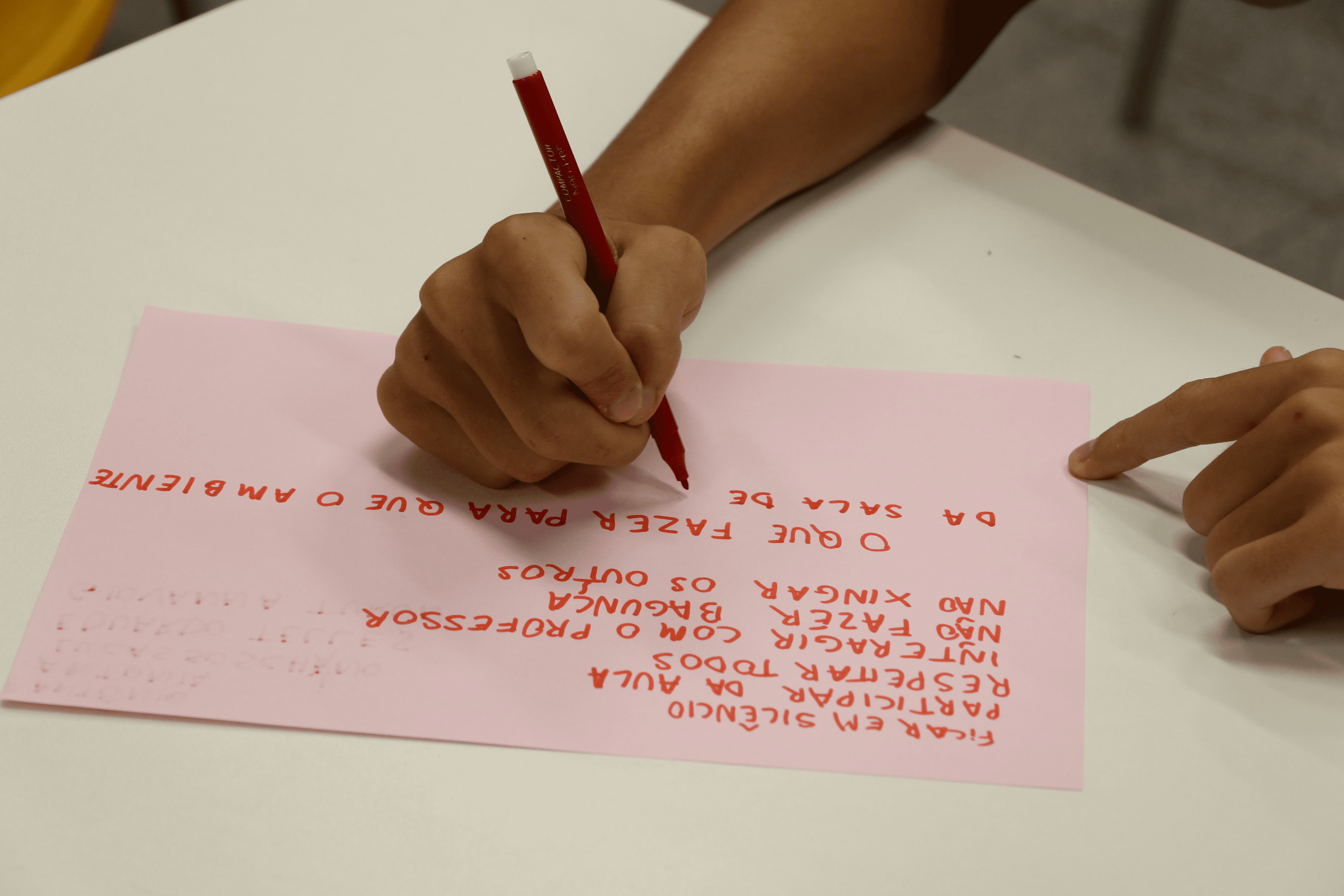 Quais as características que um bom representante tem que ter? O que o representante pode fazer para colaborar com a turma? Como incluir novos alunos? Como fazer a sala de aula um bom ambiente para aprender melhor? Essas e outras questões foram debatidas pelos grupos.