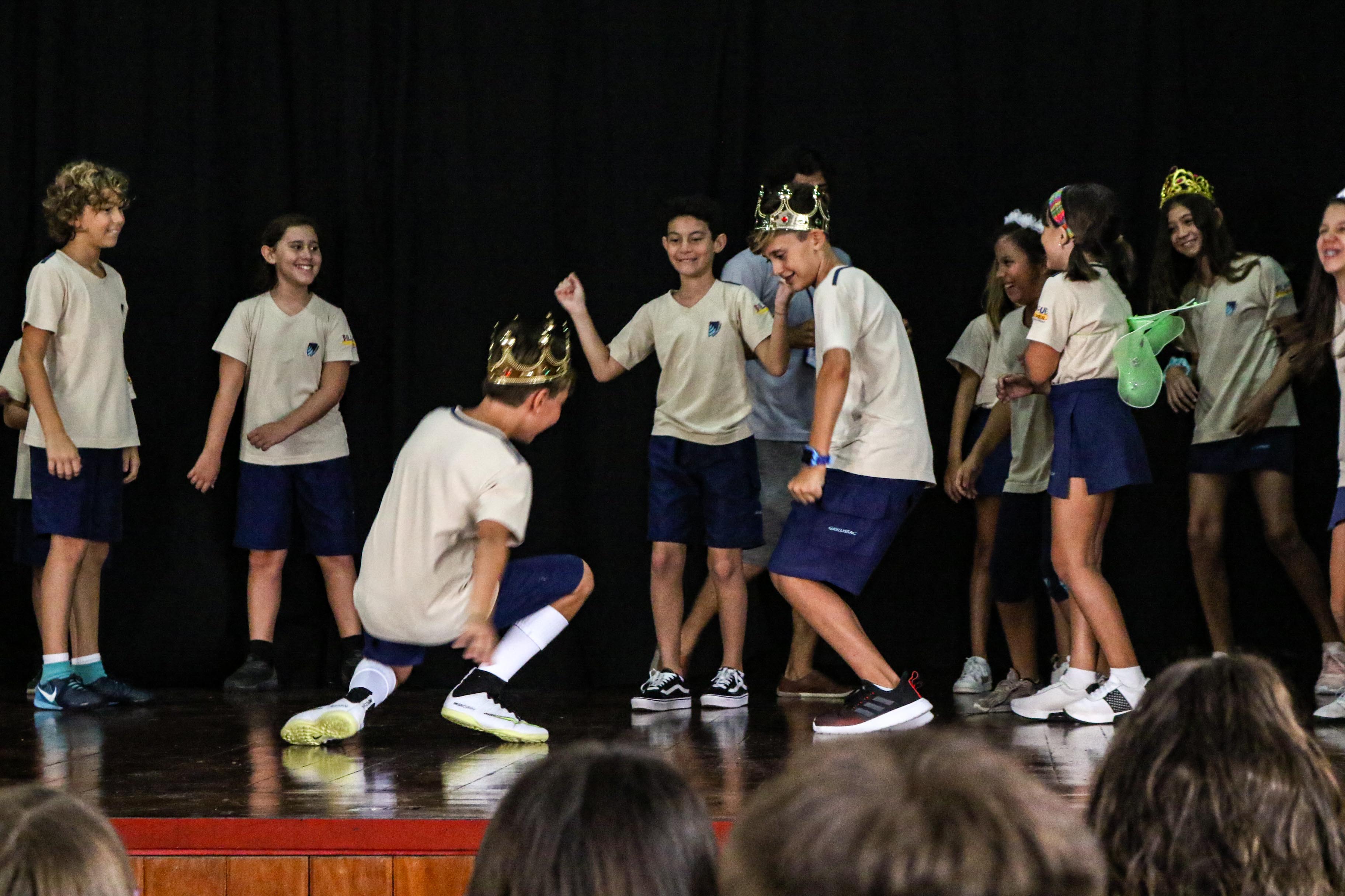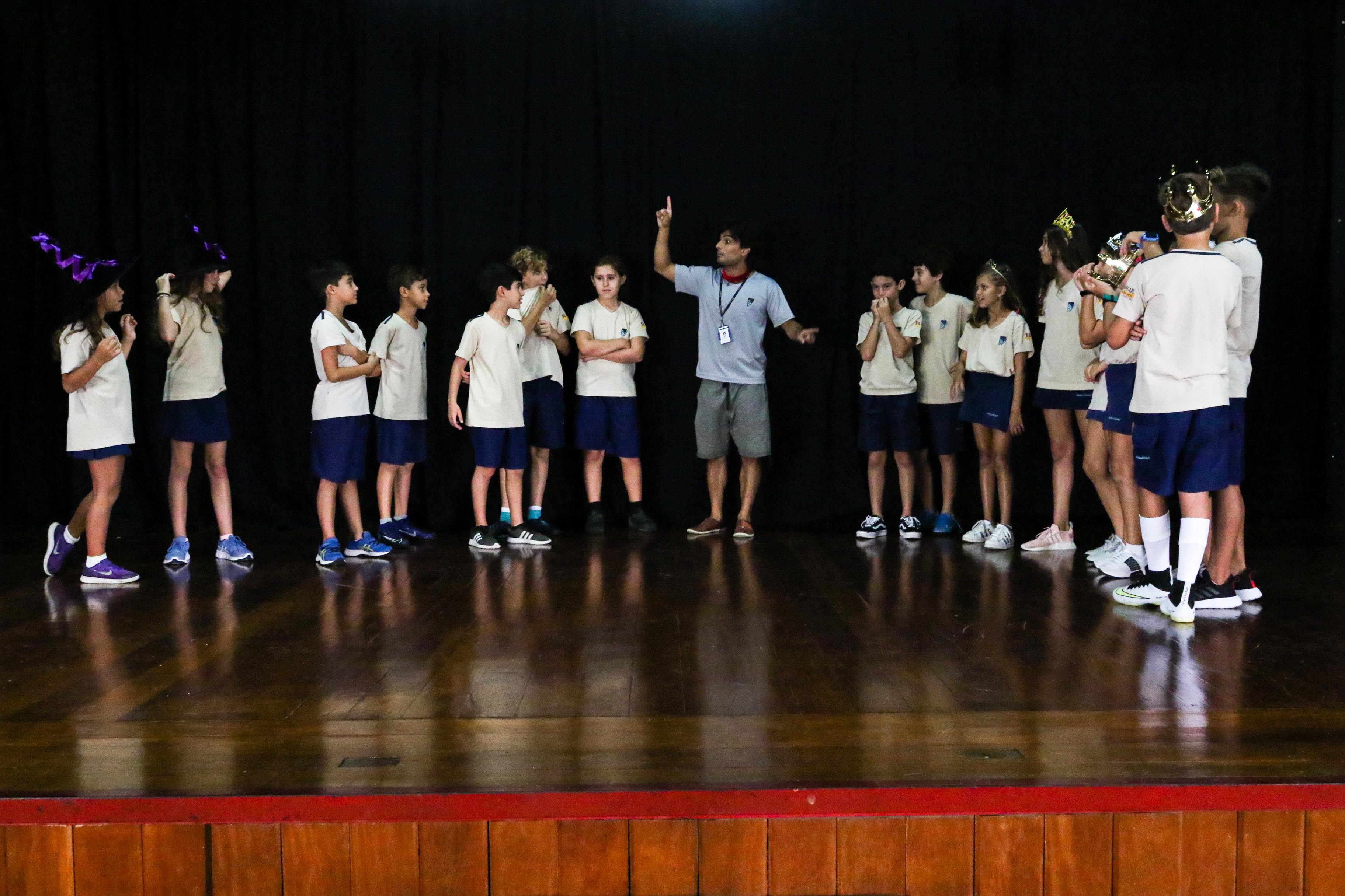 Exercício teatrais também agitaram o dia, incentivando a criatividade dos alunos através de uma peça guiada, em uma história lúdica sobre kings and queens. O objetivo é facilitar o entrosamento dos alunos, especialmente com os new comers. “Usually we plan this group activity so they can hang out, get together and have a lot of fun. It’s important that they connect to each other”, explicou Lorhan Ferreira, professor da turma Cambridge.