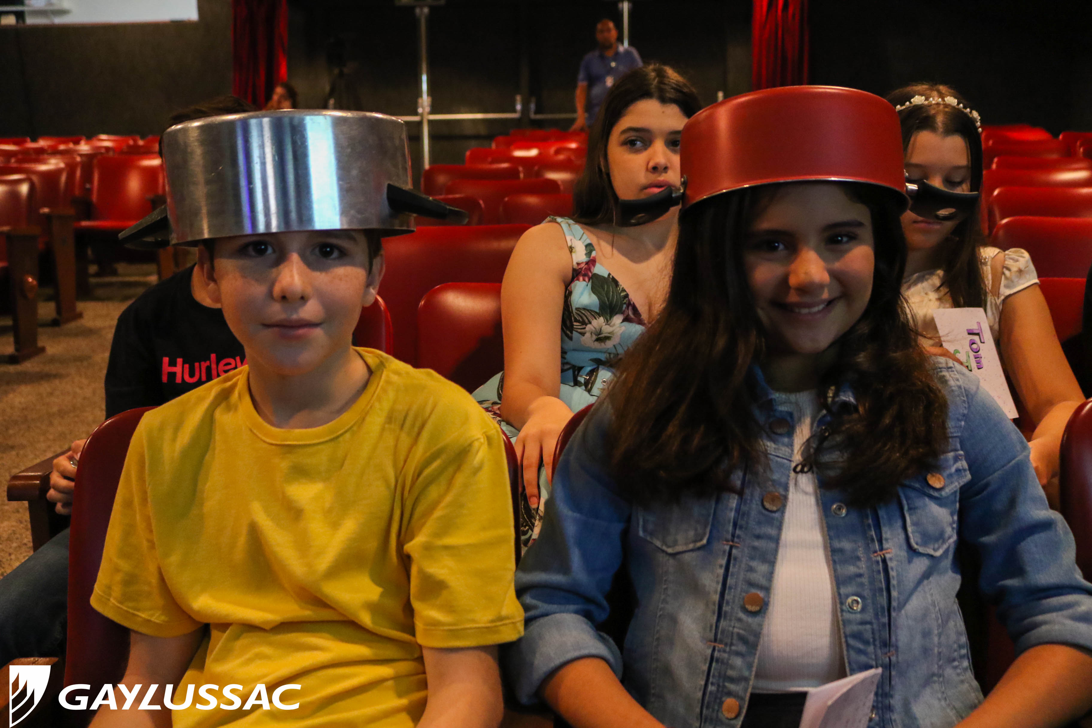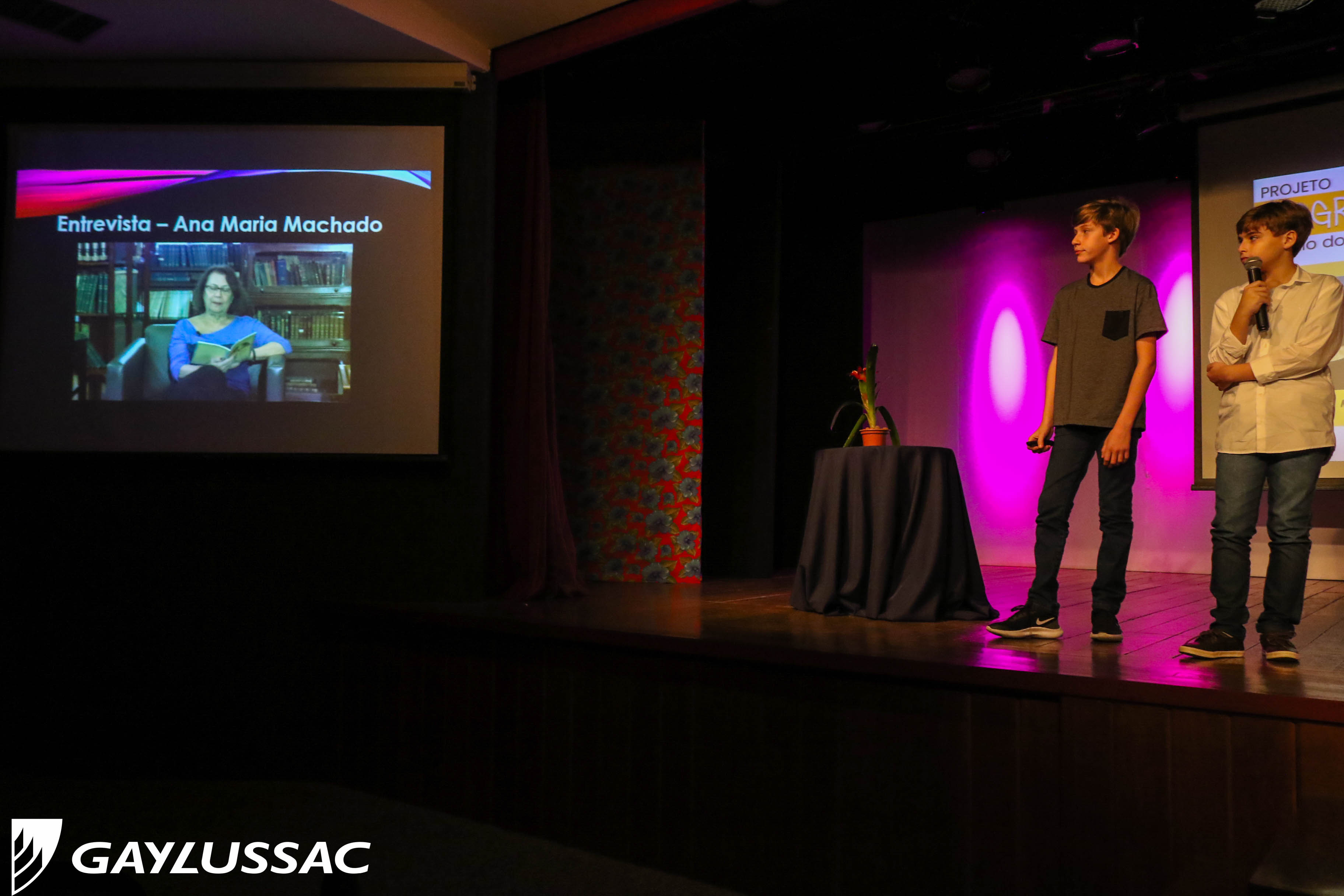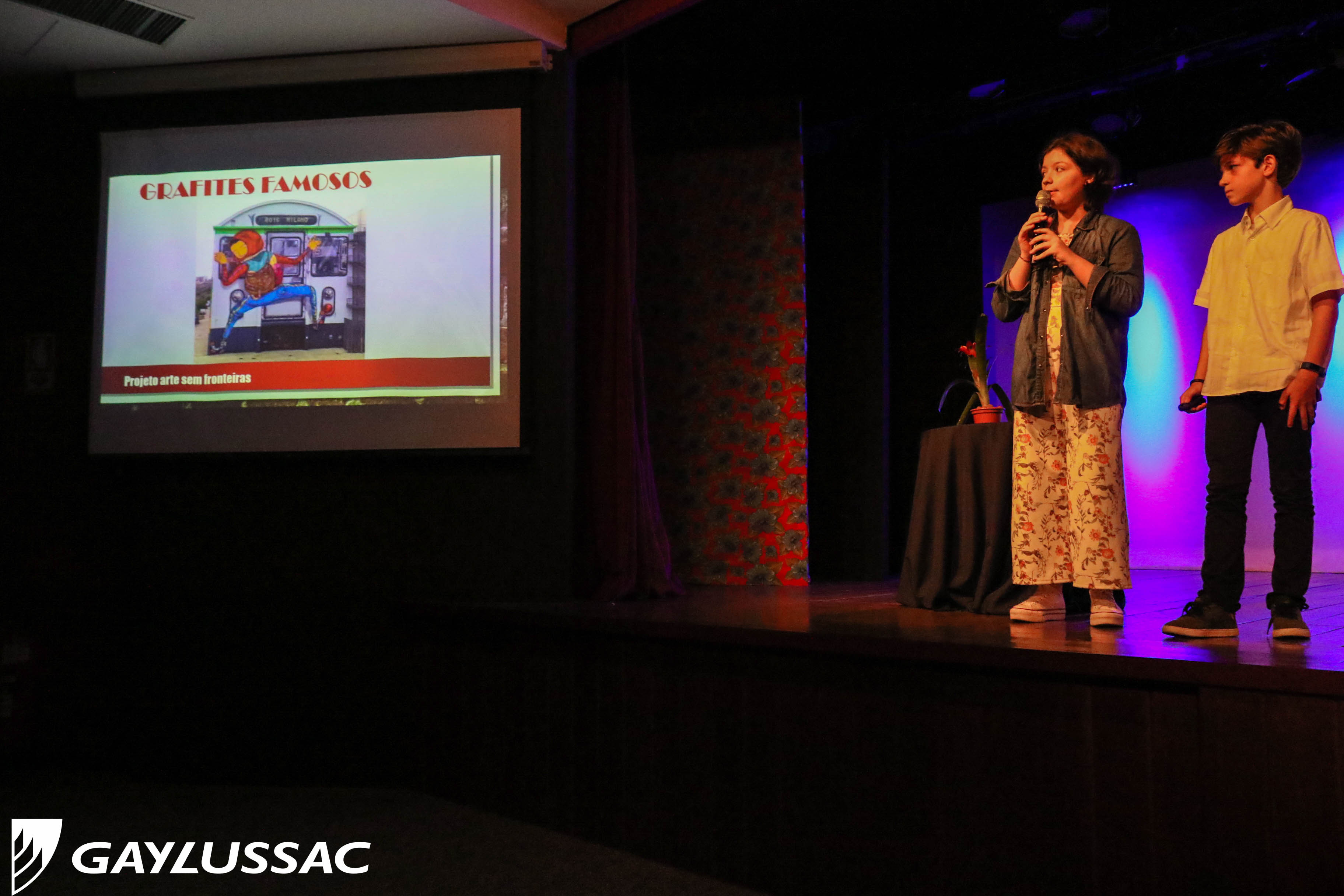O professor de Produção Textual, Gustavo Abreu, e a professora de Língua Portuguesa, Glaucia Mourão, explicam: “Para além dos conceitos de linguagem, os alunos aprendem aqui a autoconfiança, a autonomia de dirigir um trabalho, de se organizar, com onze anos subir no palco e apresentar uma aula pública para os pais e para os colegas”.