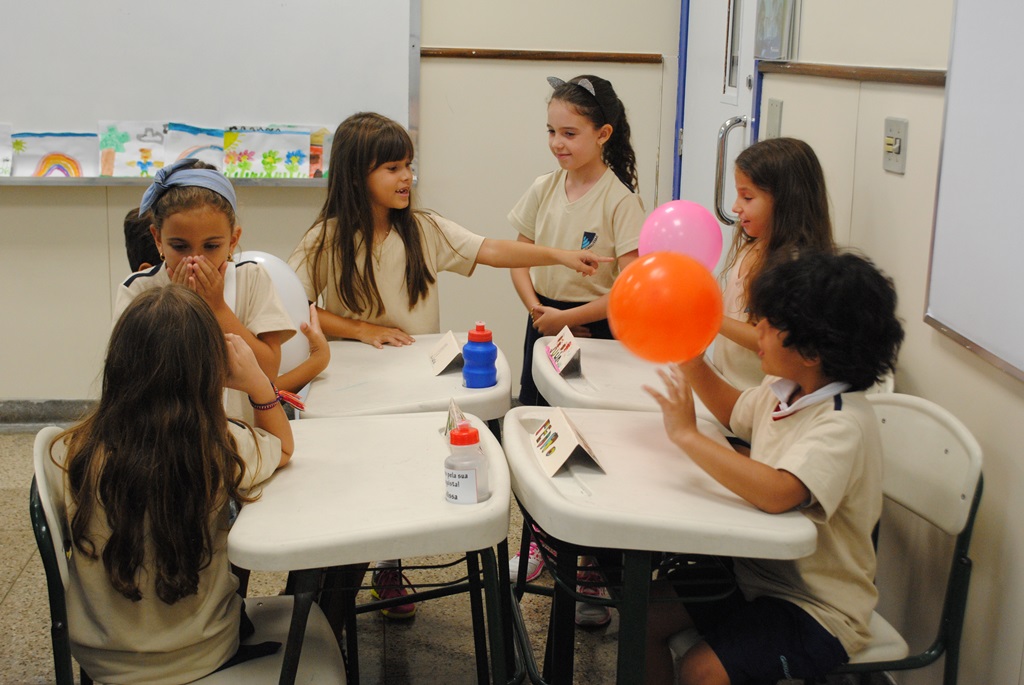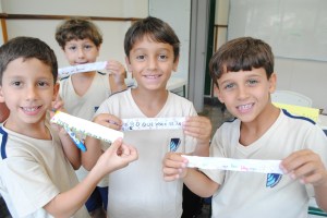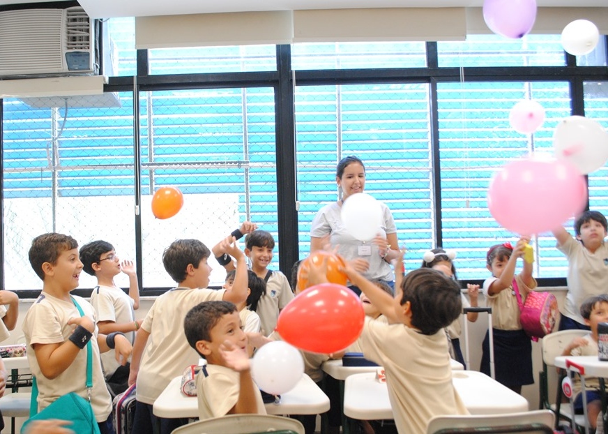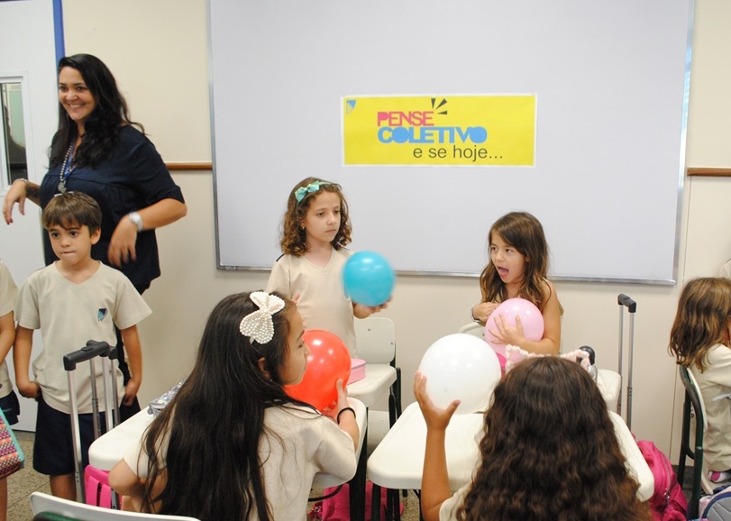 Assim, eles prepararam uma dinâmica integradora que se iniciava com uma música sobre amizade. Na mão de cada aluno do 3º ano estava uma bola colorida que continha uma mensagem de boas-vindas escrita para os colegas. Em clima de celebração as bolas foram jogadas para o alto e os pequenos do 2º ano as estouraram, lendo as mensagens escritas.