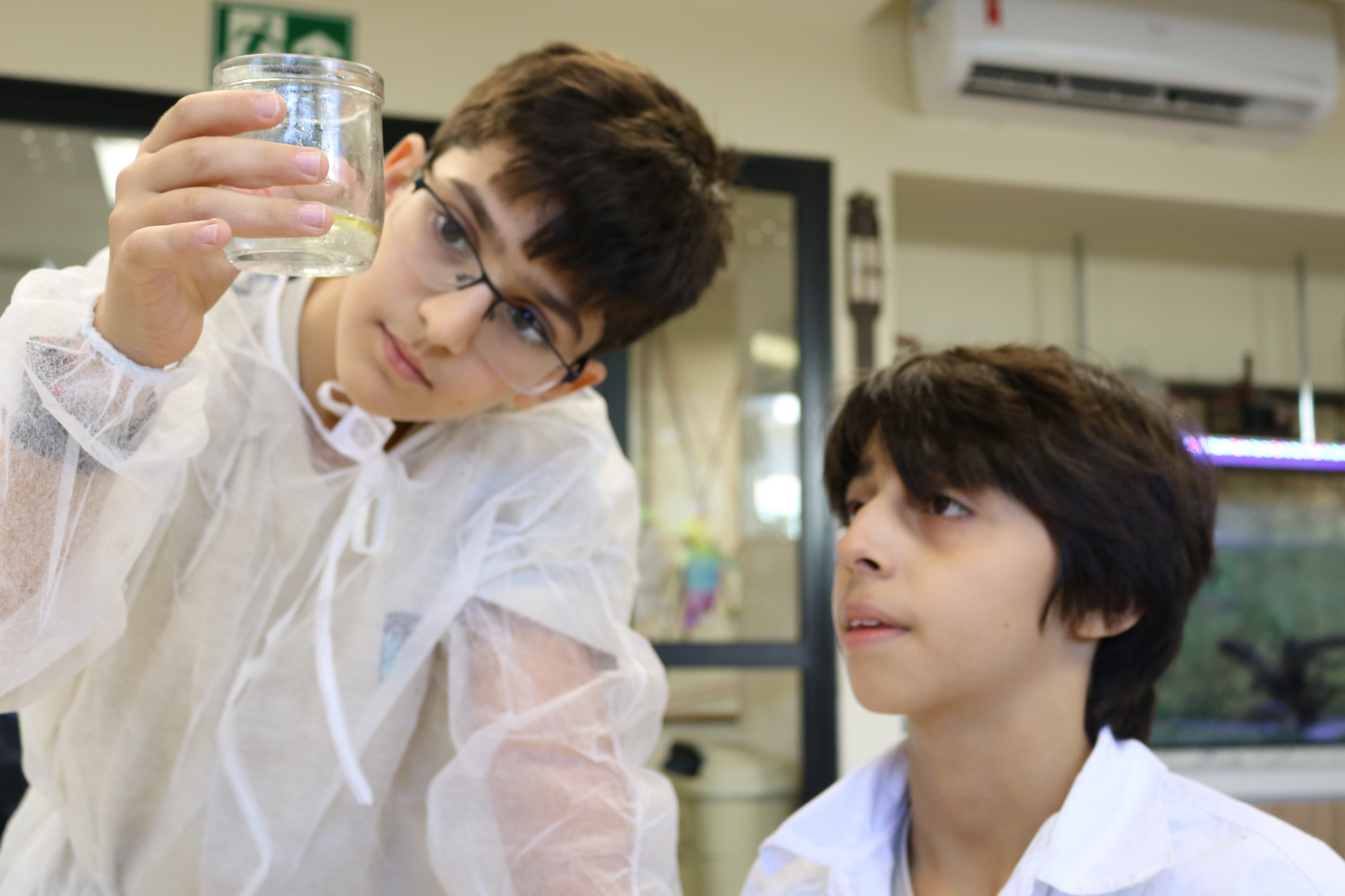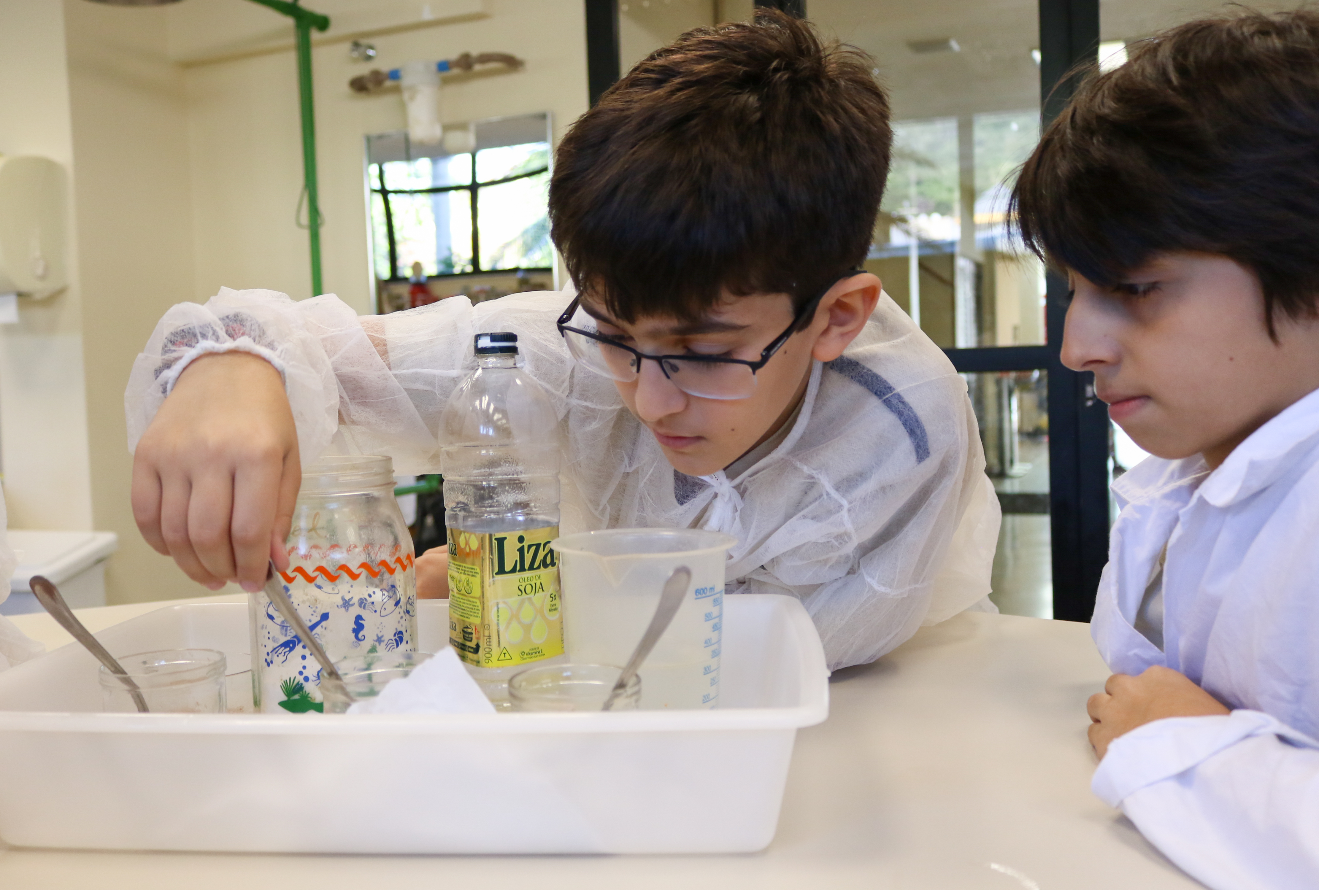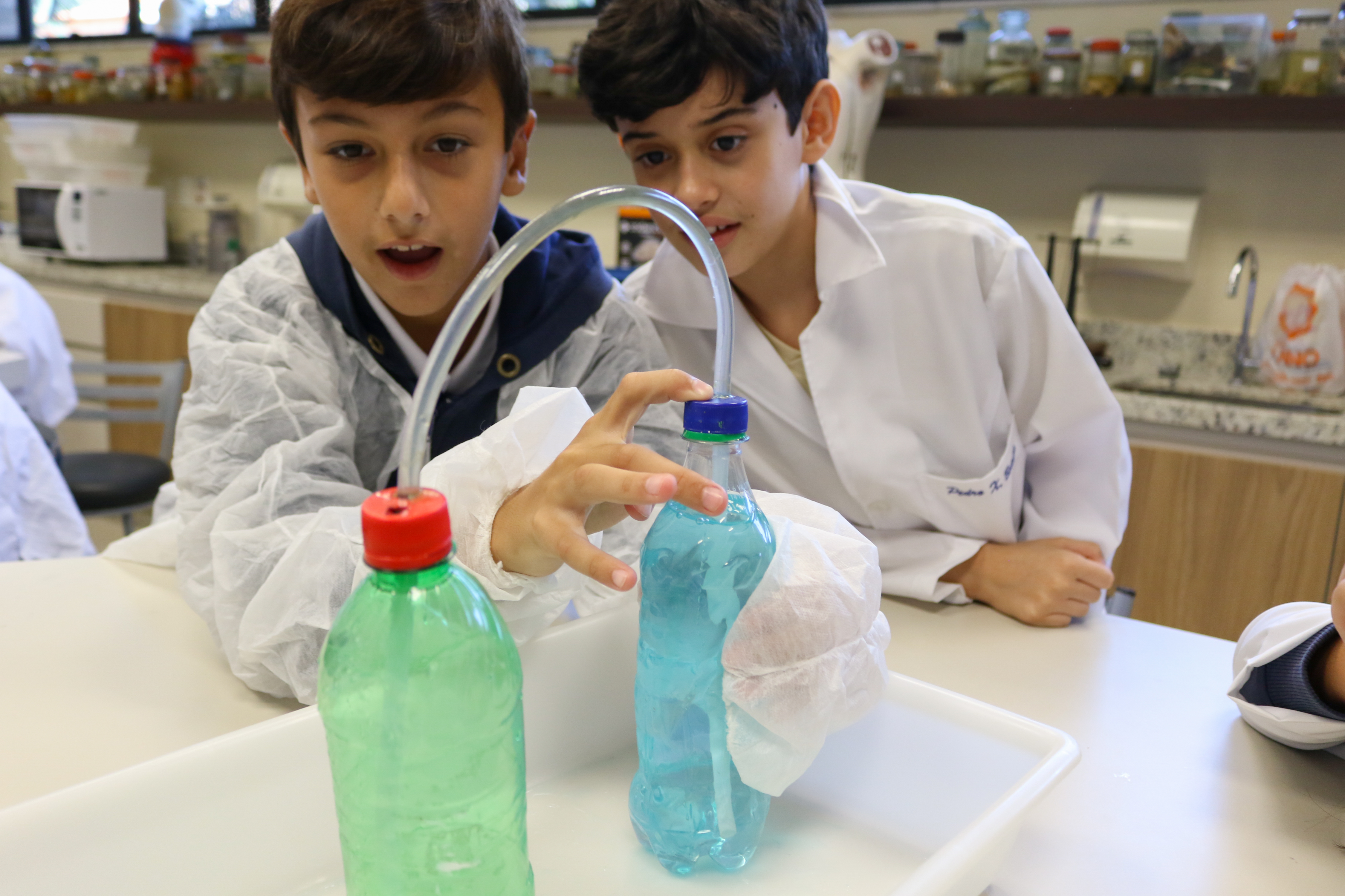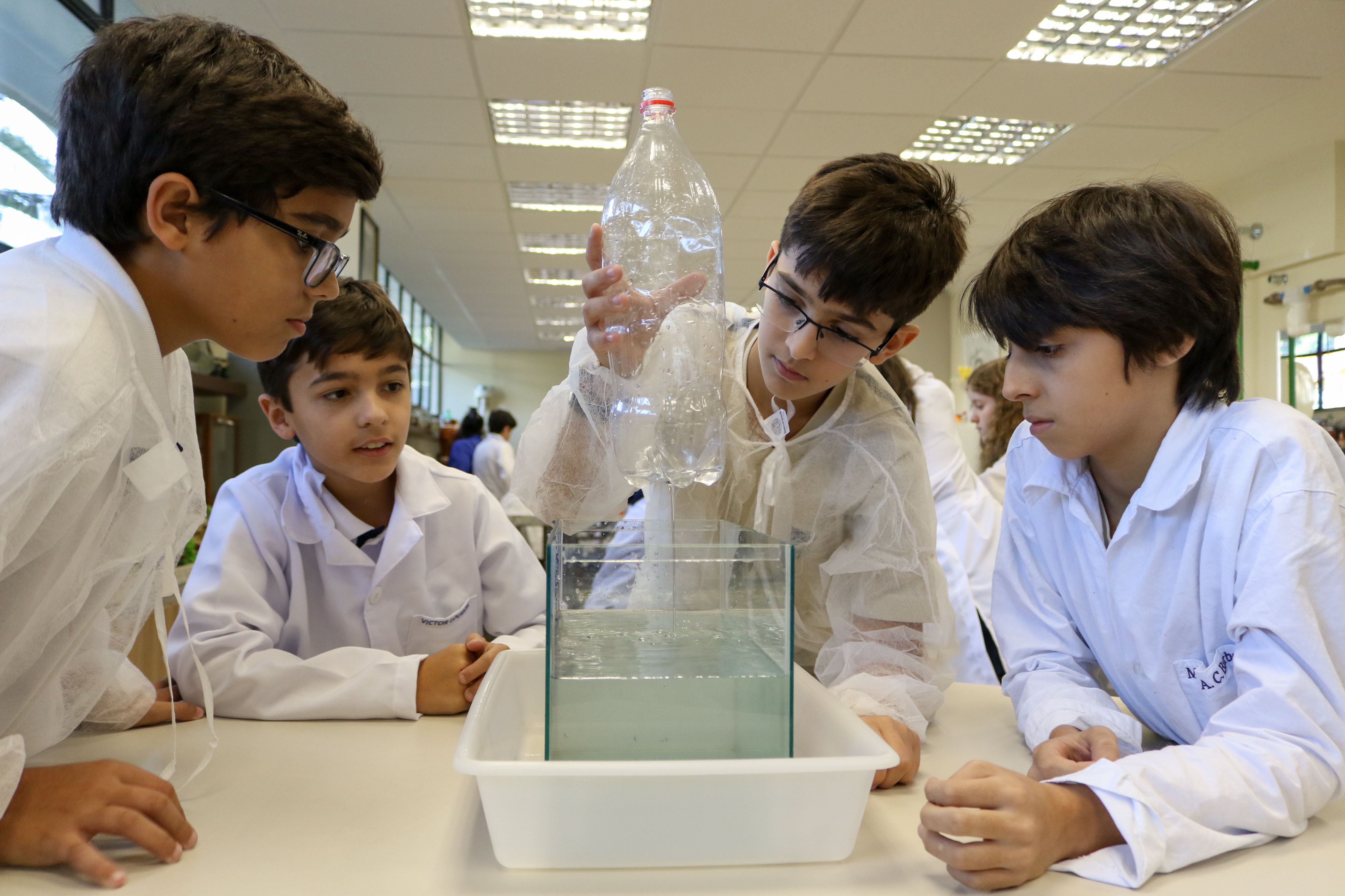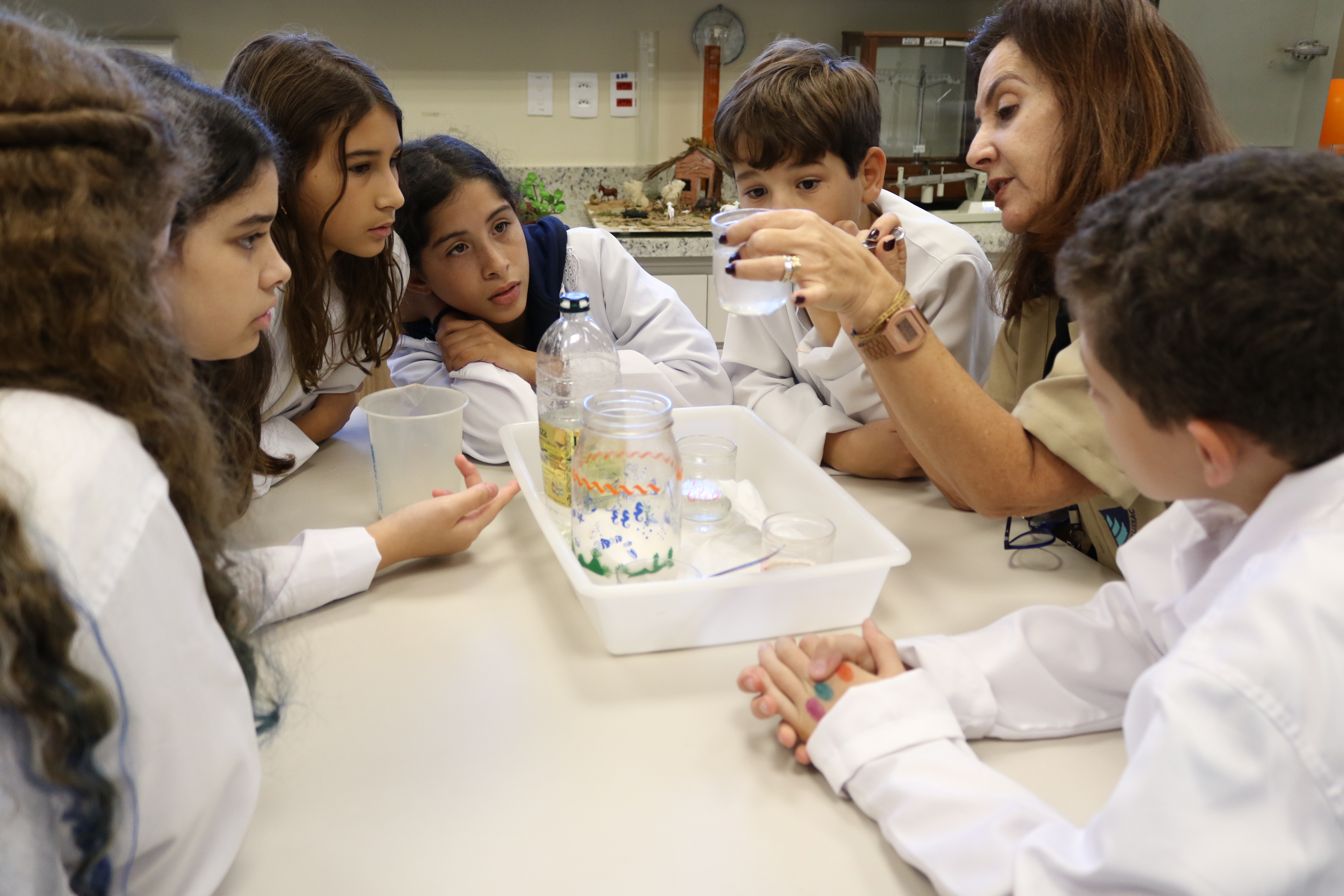 As aulas práticas de laboratório fazem com que o aprendizado aconteça de maneira inovadora. Assim, em junho, os alunos do 6º ano do Ensino Fundamental foram até o Laboratório de Multiciências entender na prática as propriedades da água, estudando conceitos como pressão, tensão superficial, vasos comunicantes, empuxo e solvência.