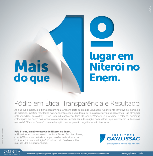 Pelo resultado oficial do Enem, o GayLussac ficou em 2º lugar em Niterói, 6º lugar no Estado do Rio de Janeiro e em 41º lugar no Brasil. São excelentes resultados para serem comemorados, sem sombra de dúvida. Continuamos entre as 50 melhores escolas do País.