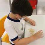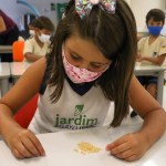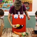 Acompanhados do monstrinho Papa Tudo, os pequenos exercitaram os conhecimentos das consoantes e vogais, identificando-as nos ingredientes da sopa! “Tem alho, cebola e cenoura aqui”, compartilhou o aluno Arthur. E então foi hora de formar palavras com o macarrão de letrinhas, atividade individual que permite que cada criança tenha a oportunidade de construir, por suas próprias percepções, processos de escrita e leitura.