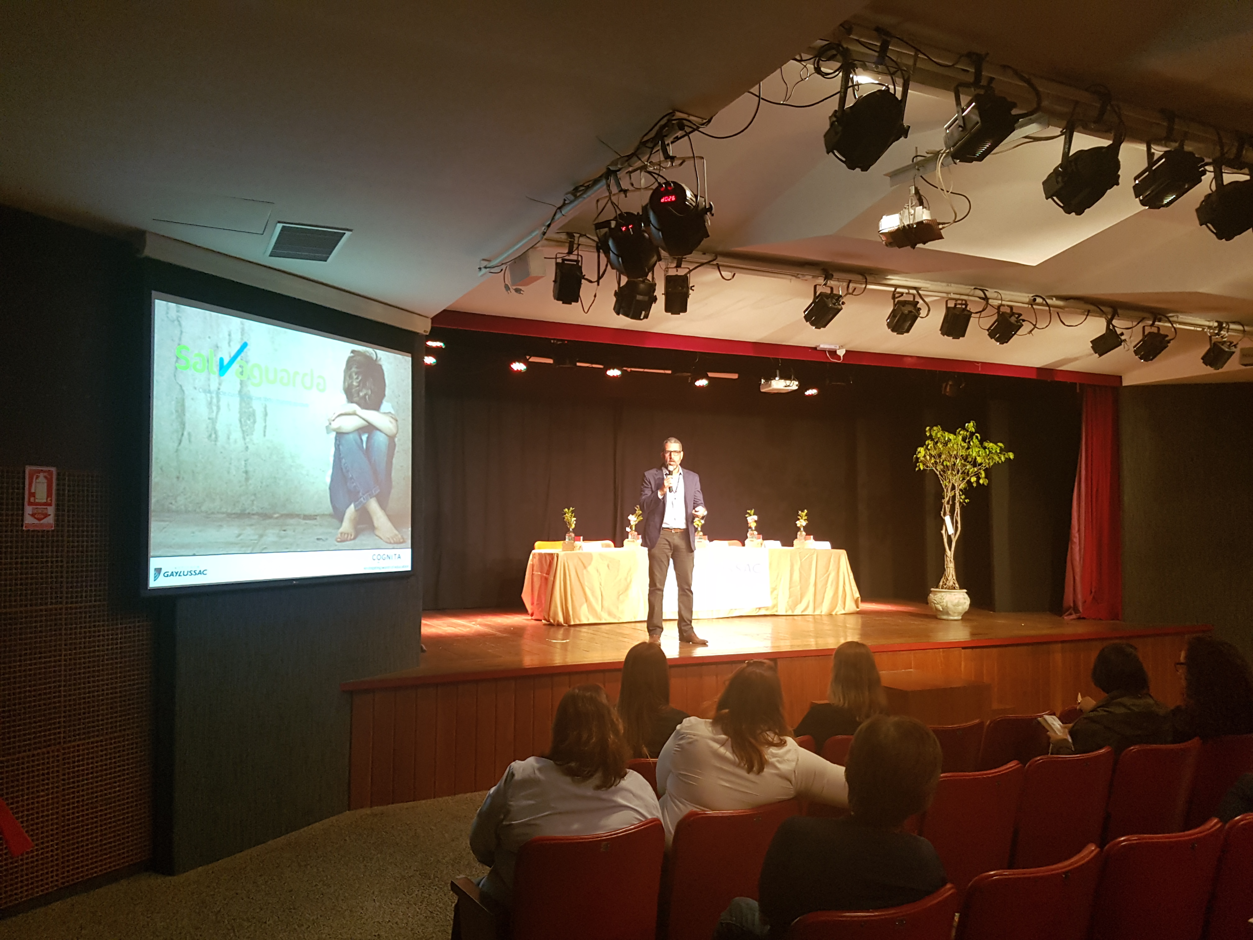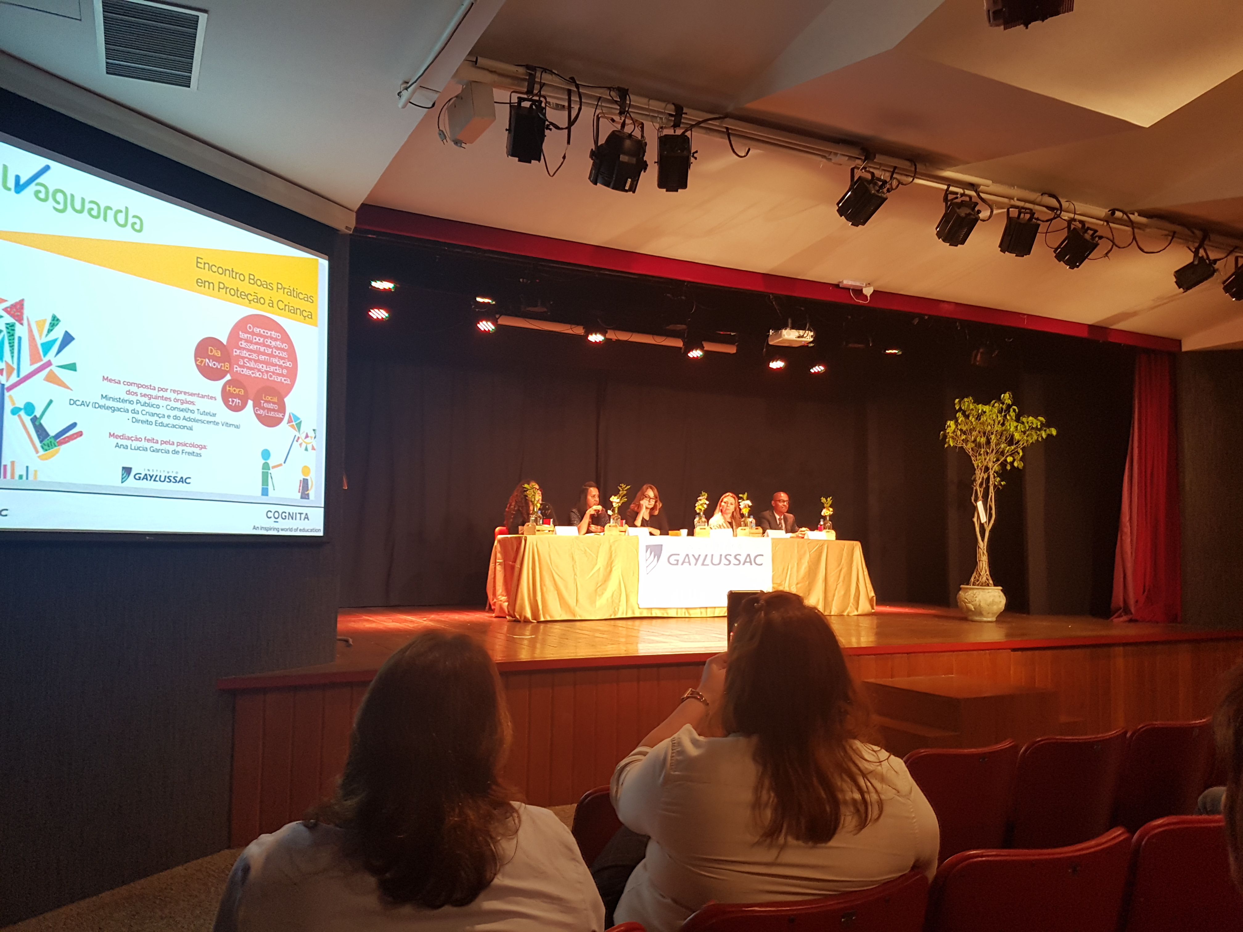 O 1º Encontro de Boas Práticas em Proteção à Criança tornou o Teatro GayLussac palco de uma experiência de diálogo e parceria entre escolas e entidades públicas de proteção à criança. Compunham a mesa Ana Cristina Macedo, promotora da vara de infância e juventude do Ministério Público, Rita Macario, presidente do Conselho Tutelar; Mônica Alves, da Delegacia de Proteção à Criança e Daniel Welbert, advogado especializado em direito educacional. O bate-papo foi mediado pela nossa psicóloga escolar Ana Lúcia Garcia de Freitas.