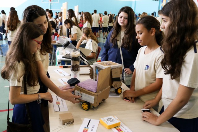 Experimentos de ilusão de óticas; um “carduíno”, veículo montado e projetado pelos alunos; as formas geométricas, simetria e ângulos presentes na dança, na música e na arte de Mondrian a Picasso; barquinhos movidos a minicaldeiras a vapor; mãos e garras projetadas com a pressão da seringa; foguetes feitos de garrafas PET; descobrir o que causava um incêndio através de desafios matemáticos em um jogo de Escape; tudo isso e muito mais estava presente no sábado, dia 22 de setembro, na Mostra da Semana STEAM.