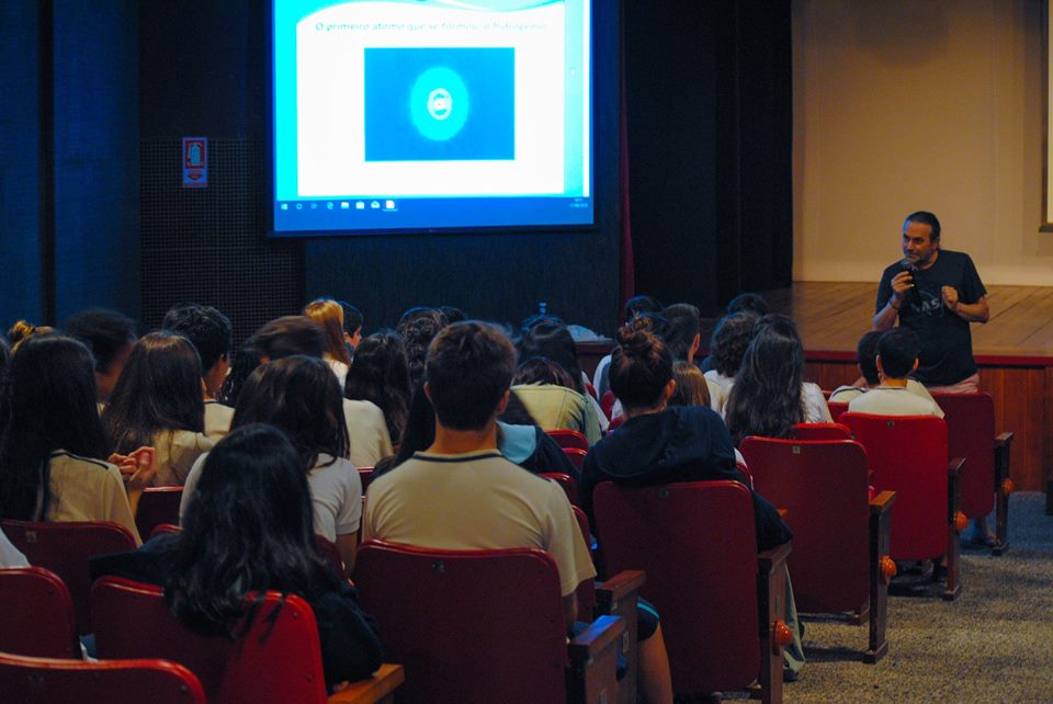 As turmas do 9º ano e da 1ª série contaram com a palestra “Do interior do átomo às galáxias”, ministrada pelo Doutor em Física, José Abdalla Helayël-Neto, Pesquisador Titular do Centro Brasileiro de Pesquisas Físicas (CBPF). Assuntos como a complexidade da natureza e descobertas recentes sobre a origem do universo, estiveram presentes na apresentação.