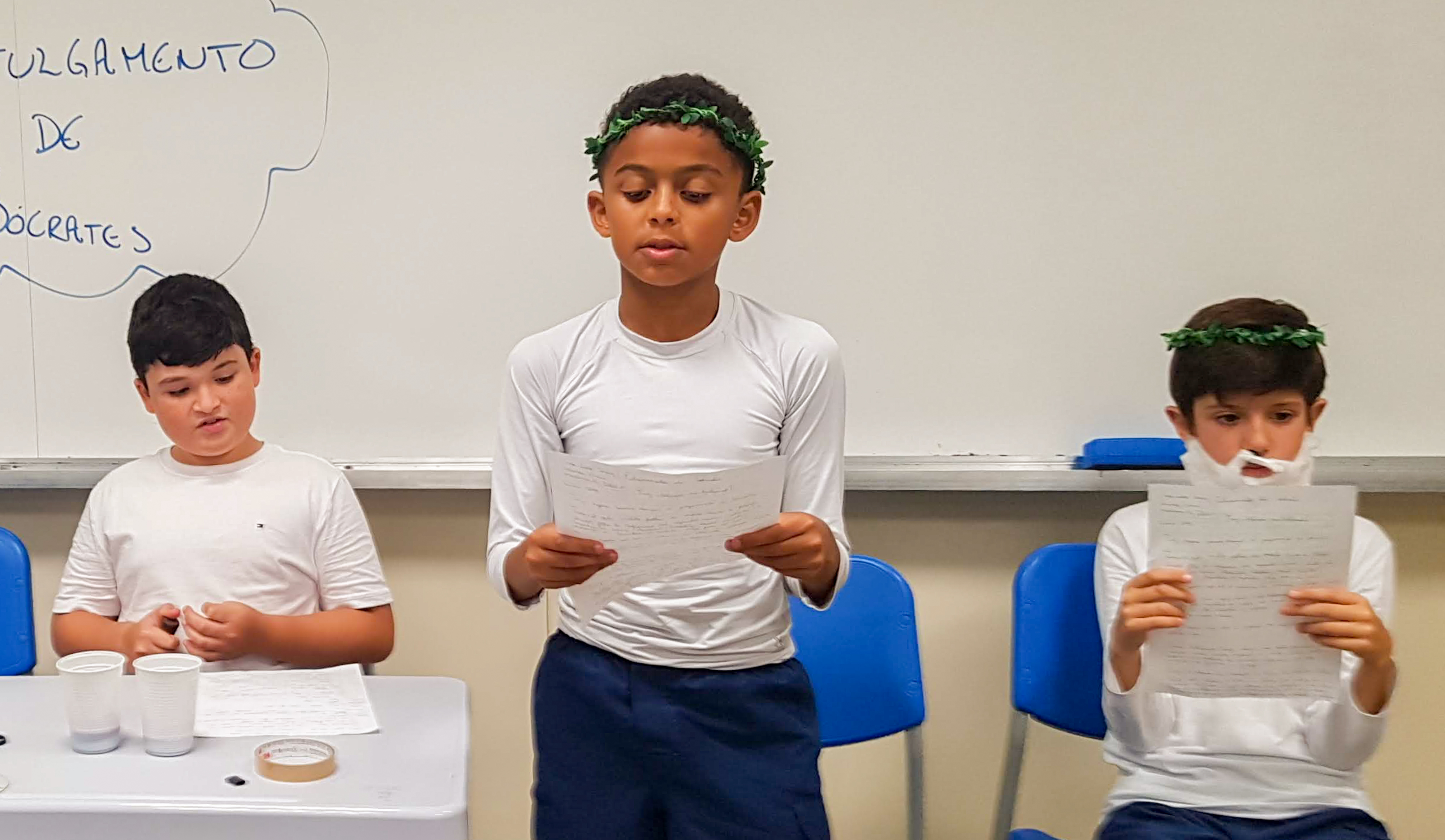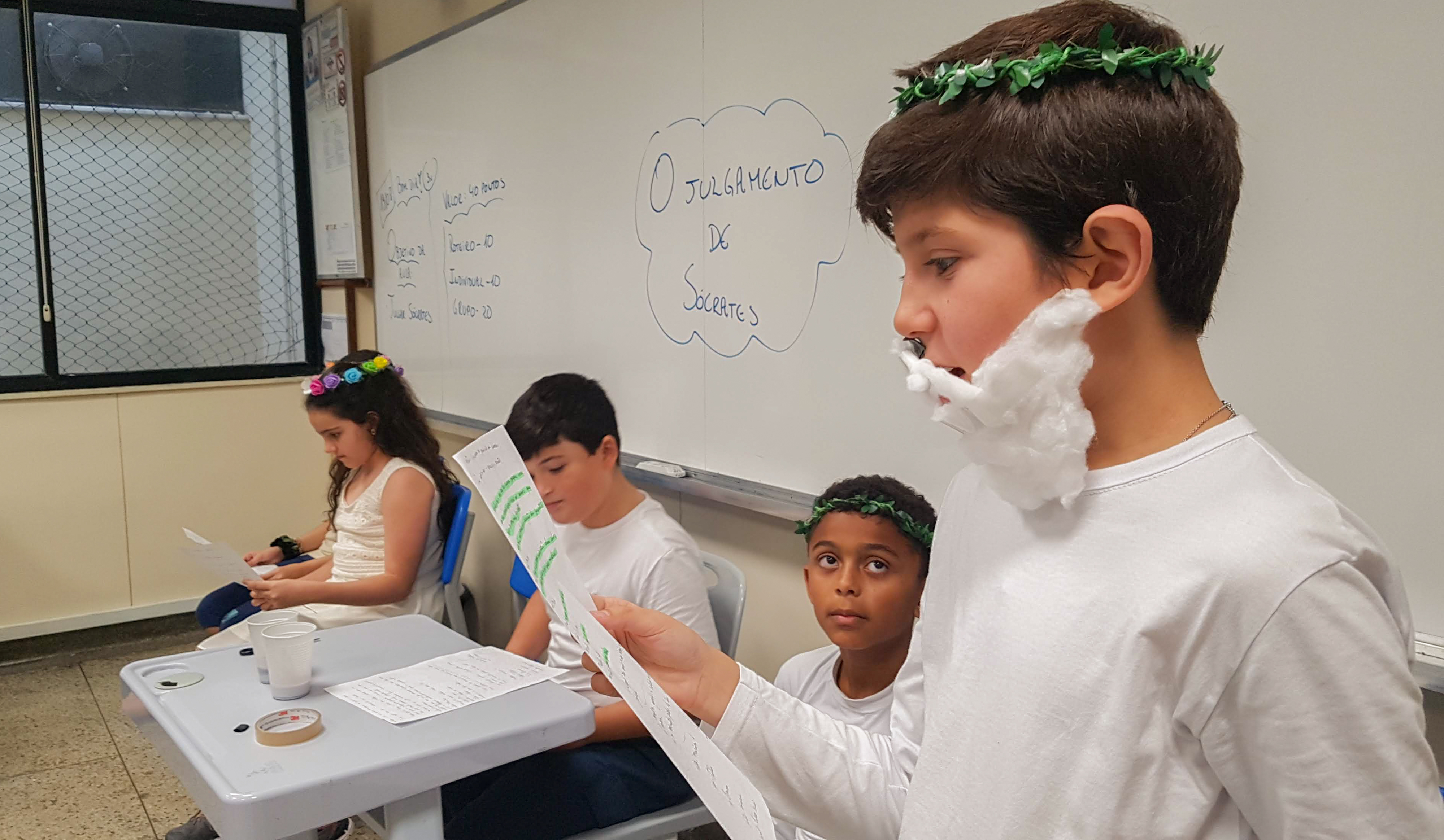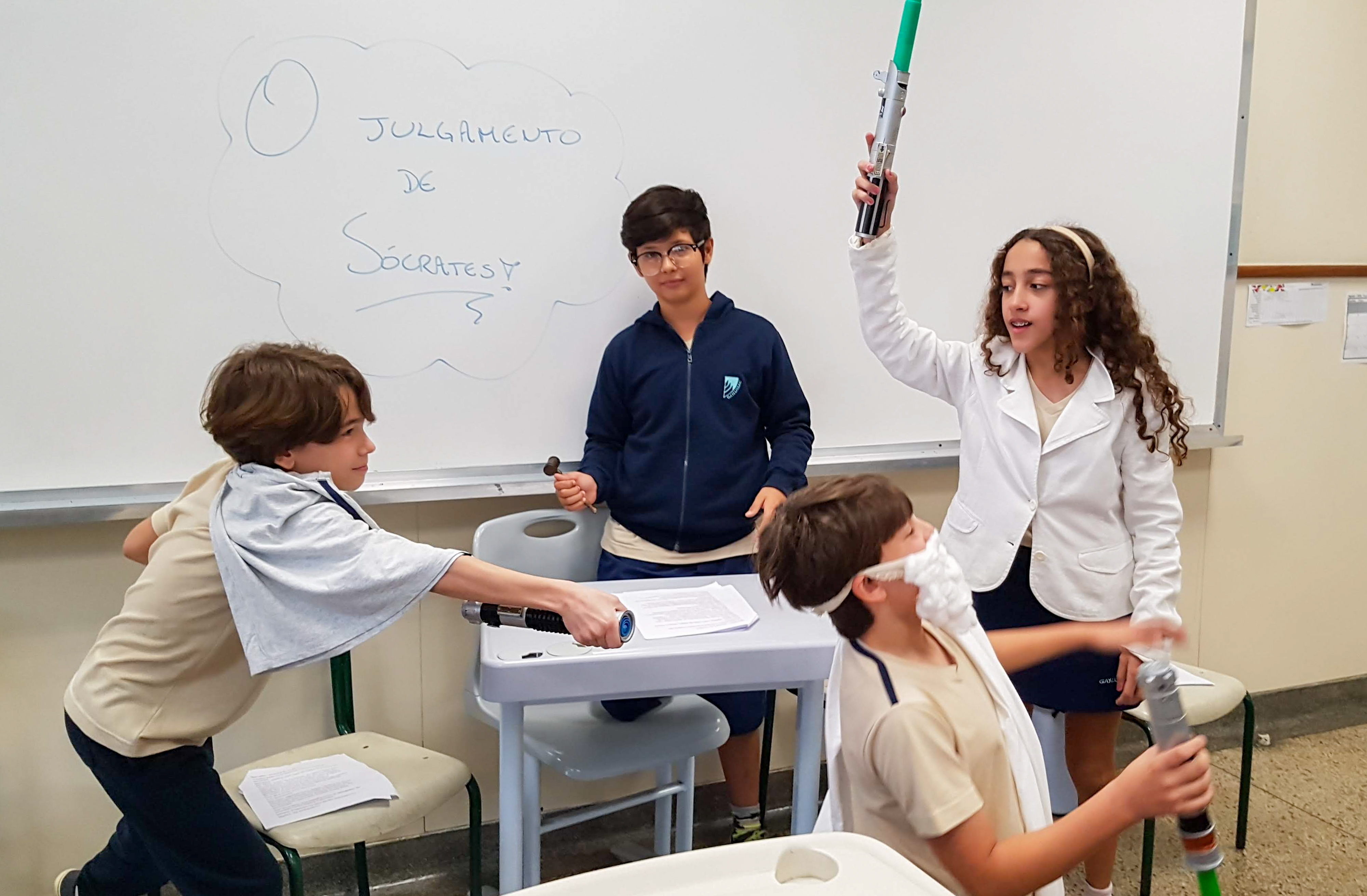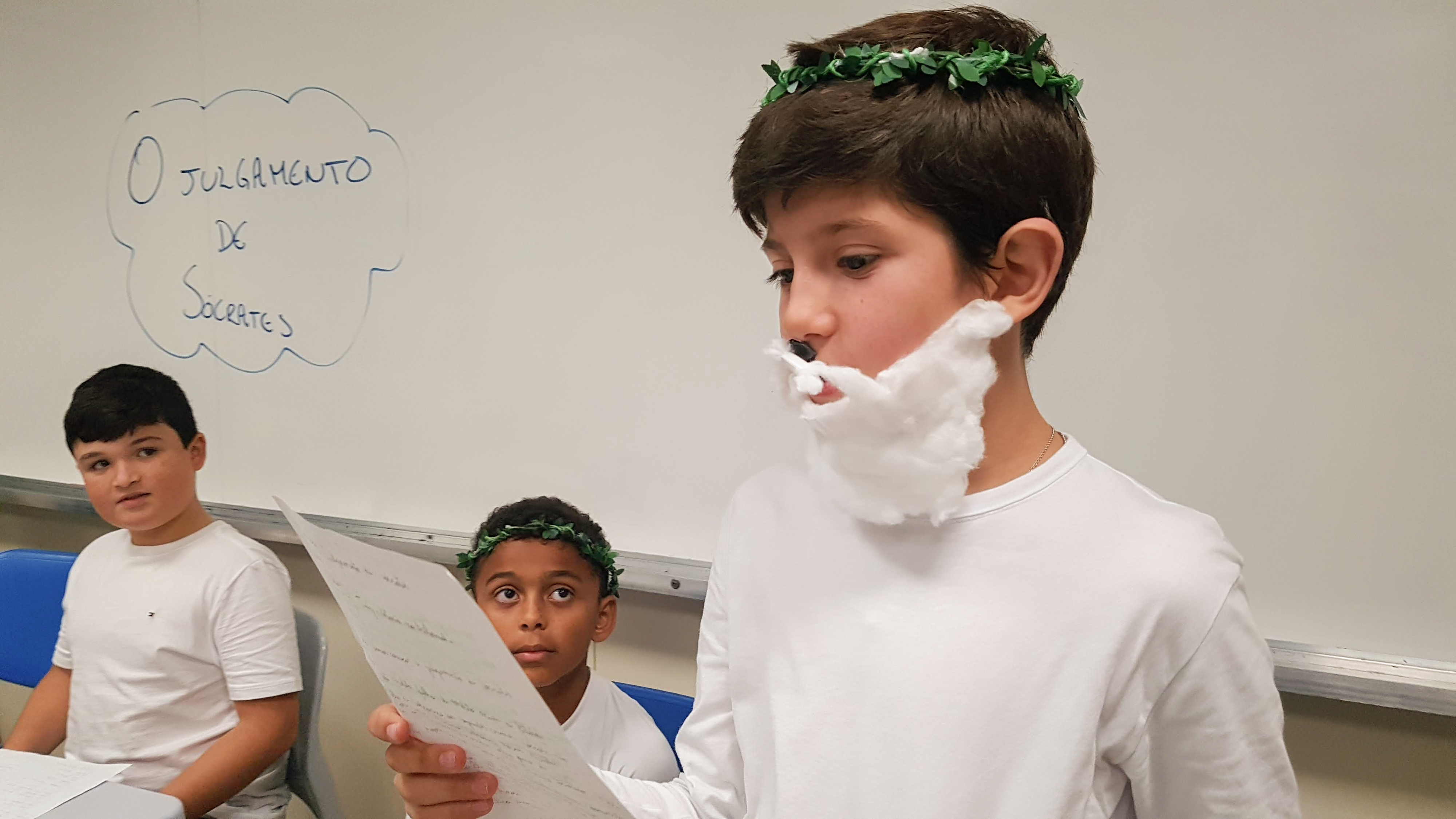 “Declaro aberto o julgamento de Sócrates”. Assim começou a apresentação de um dos grupos nas aulas de Cidadania e Salvaguarda. O conceito de democracia e o julgamento mais famoso da Grécia Antiga foram pauta de debate para os alunos do 6º ano do Ensino Fundamental. A proposta da professora Priscila Aquino foi que os alunos estudassem os personagens do julgamento e elaborassem um roteiro para simulação. Caracterizados e com as falas na ponta da língua, as turmas modificaram e atualizaram a história e os personagens em uma atividade lúdica e criativa repleta de aprendizado.