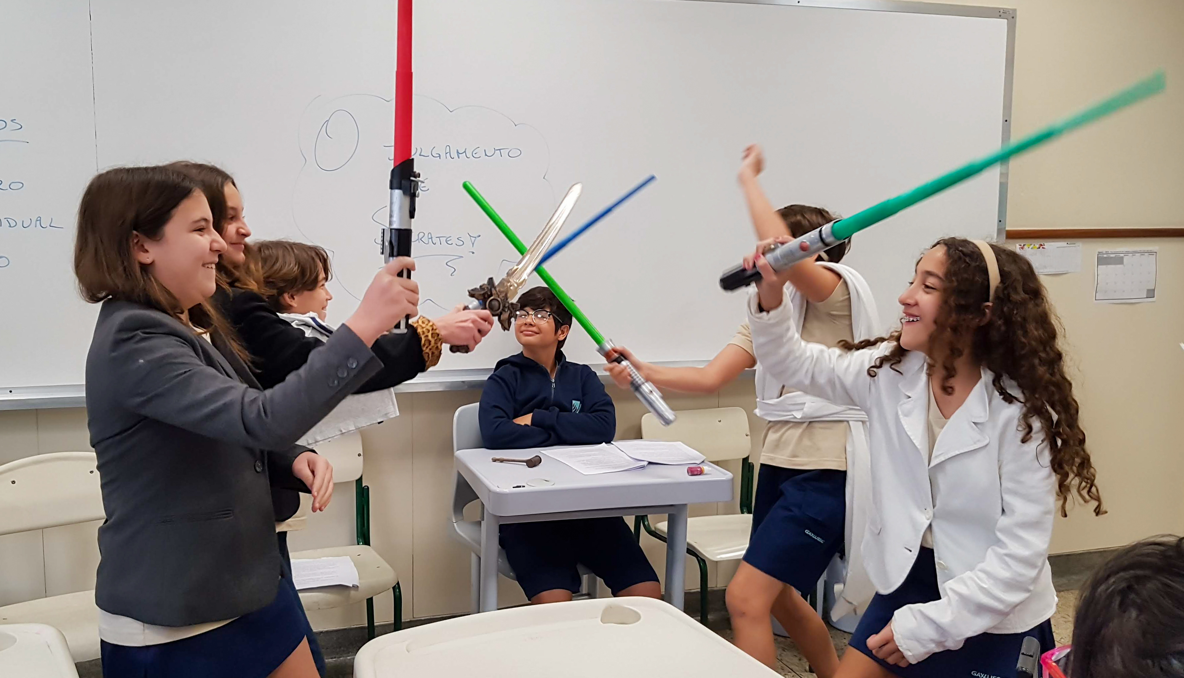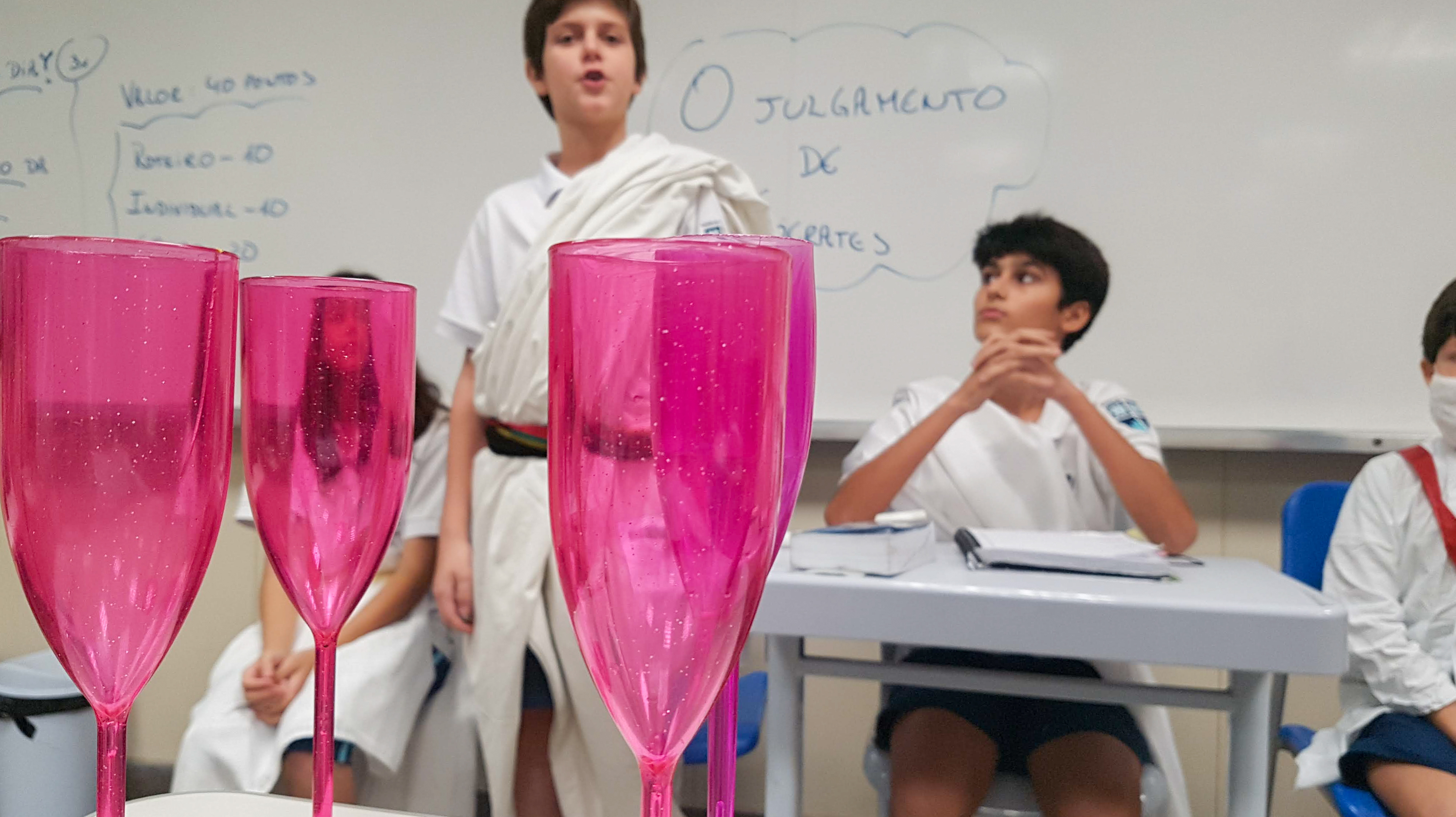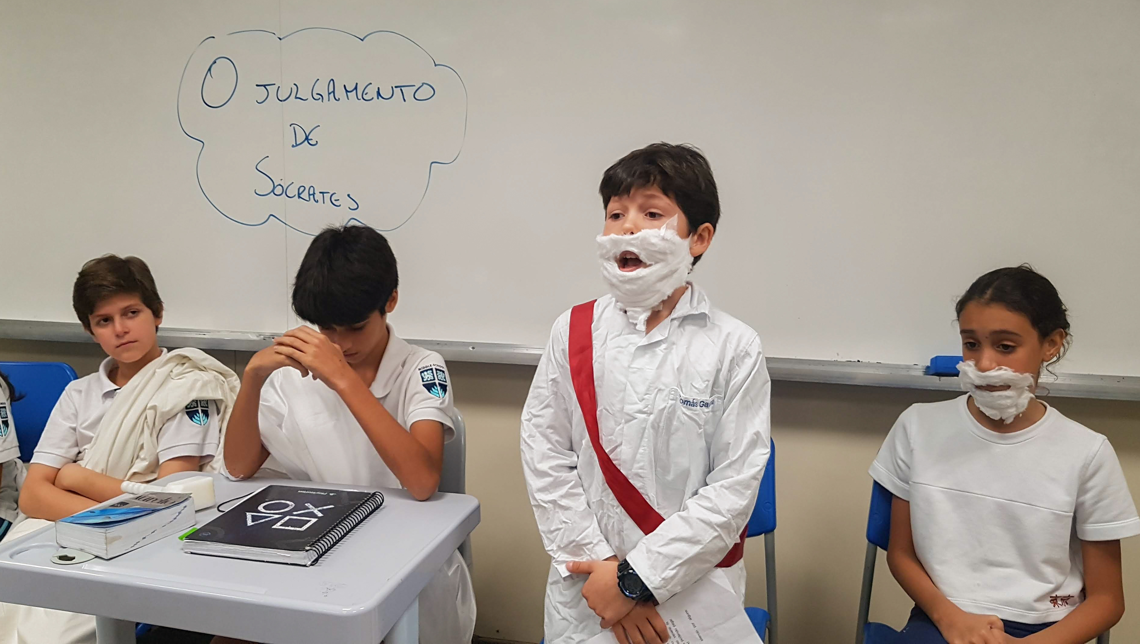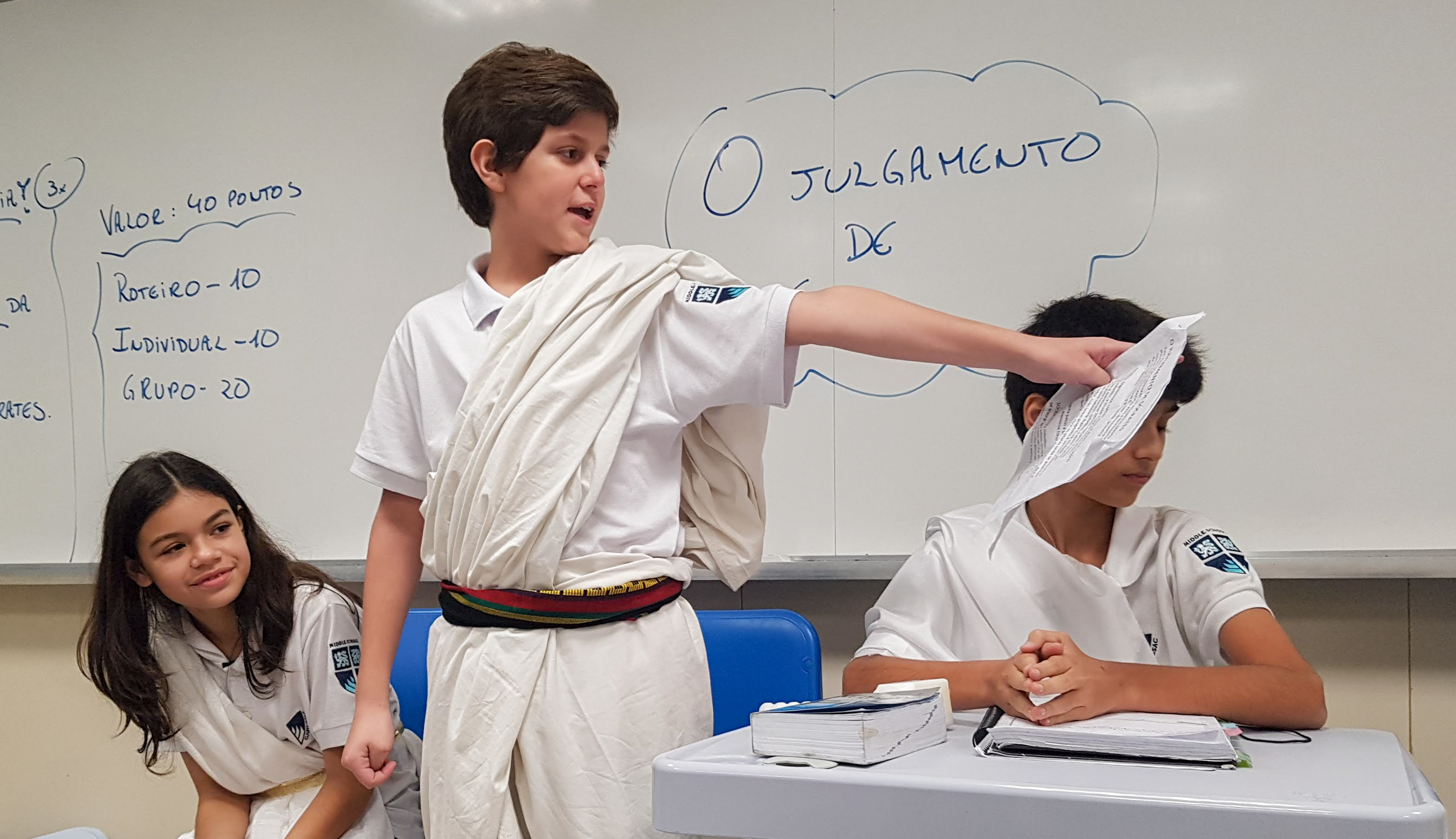 “Declaro aberto o julgamento de Sócrates”. Assim começou a apresentação de um dos grupos nas aulas de Cidadania e Salvaguarda. O conceito de democracia e o julgamento mais famoso da Grécia Antiga foram pauta de debate para os alunos do 6º ano do Ensino Fundamental. A proposta da professora Priscila Aquino foi que os alunos estudassem os personagens do julgamento e elaborassem um roteiro para simulação. Caracterizados e com as falas na ponta da língua, as turmas modificaram e atualizaram a história e os personagens em uma atividade lúdica e criativa repleta de aprendizado.