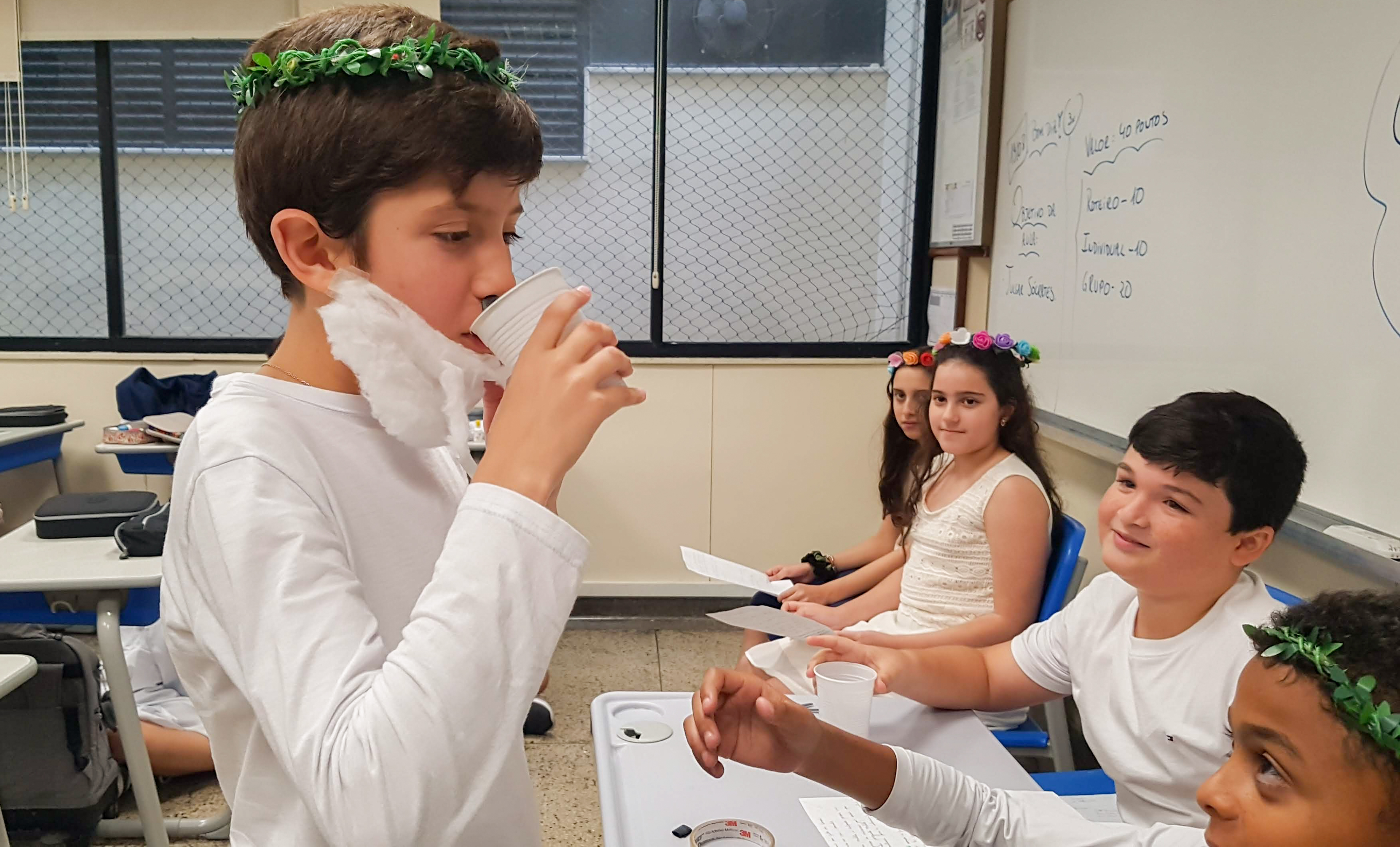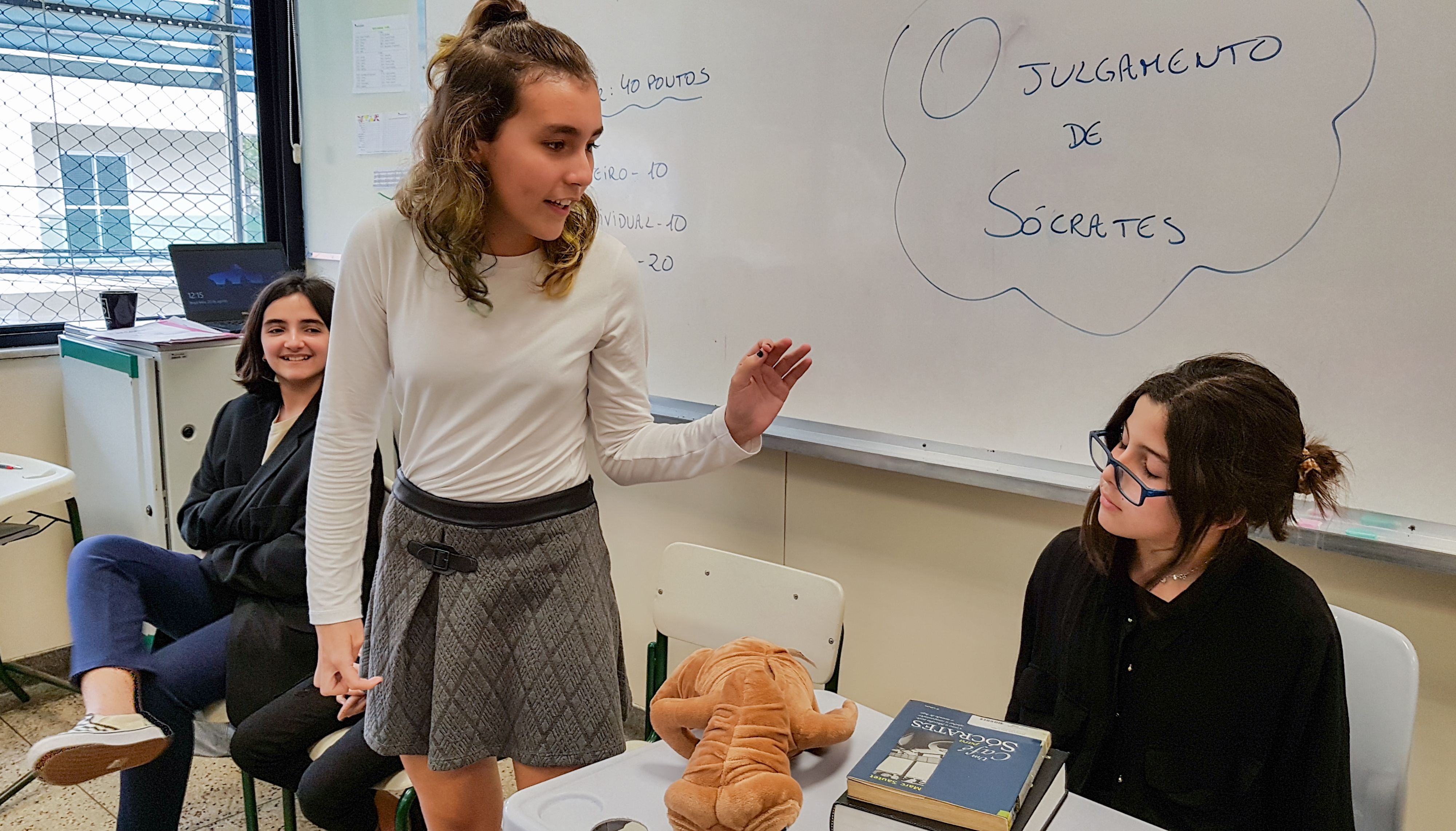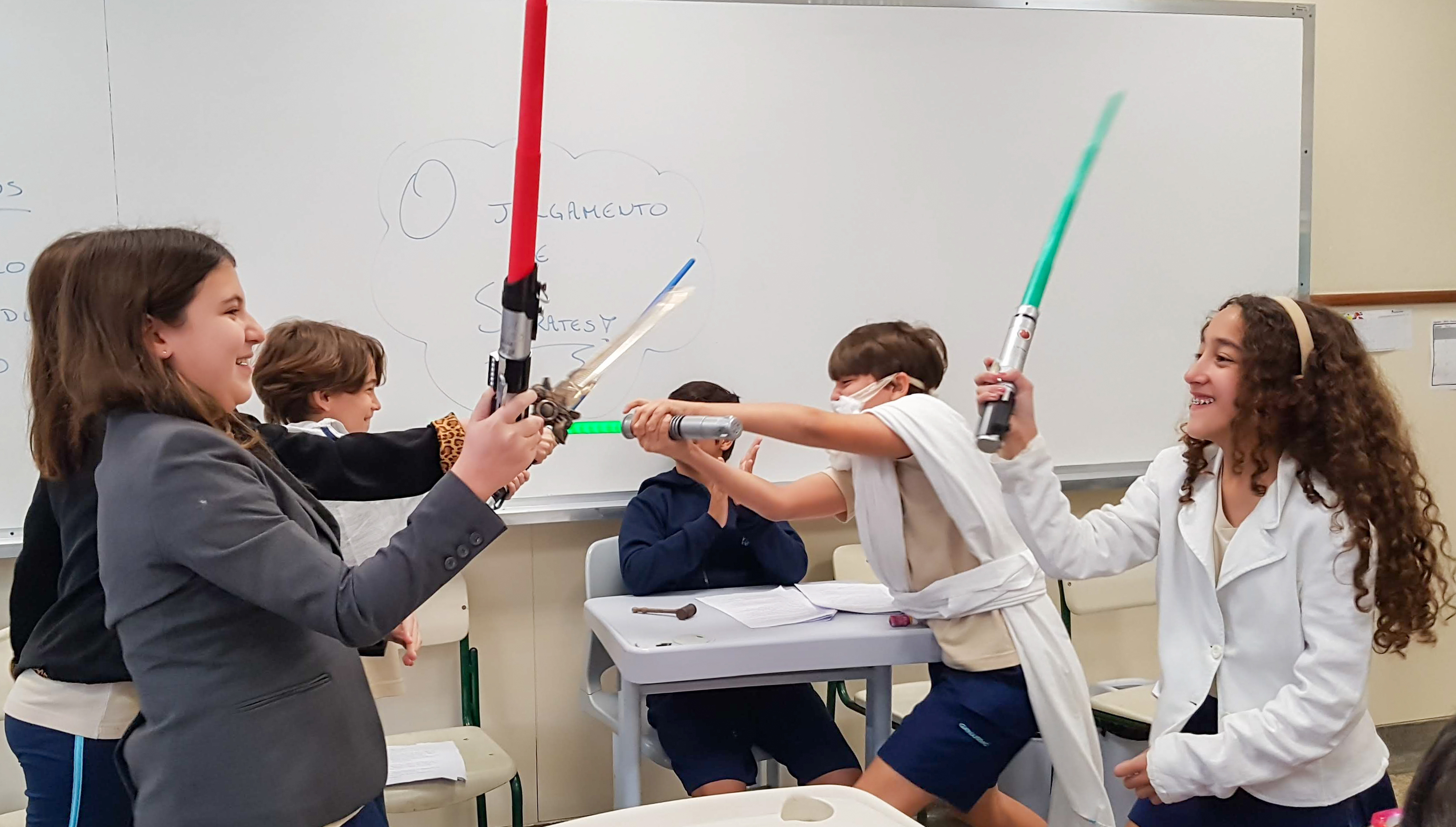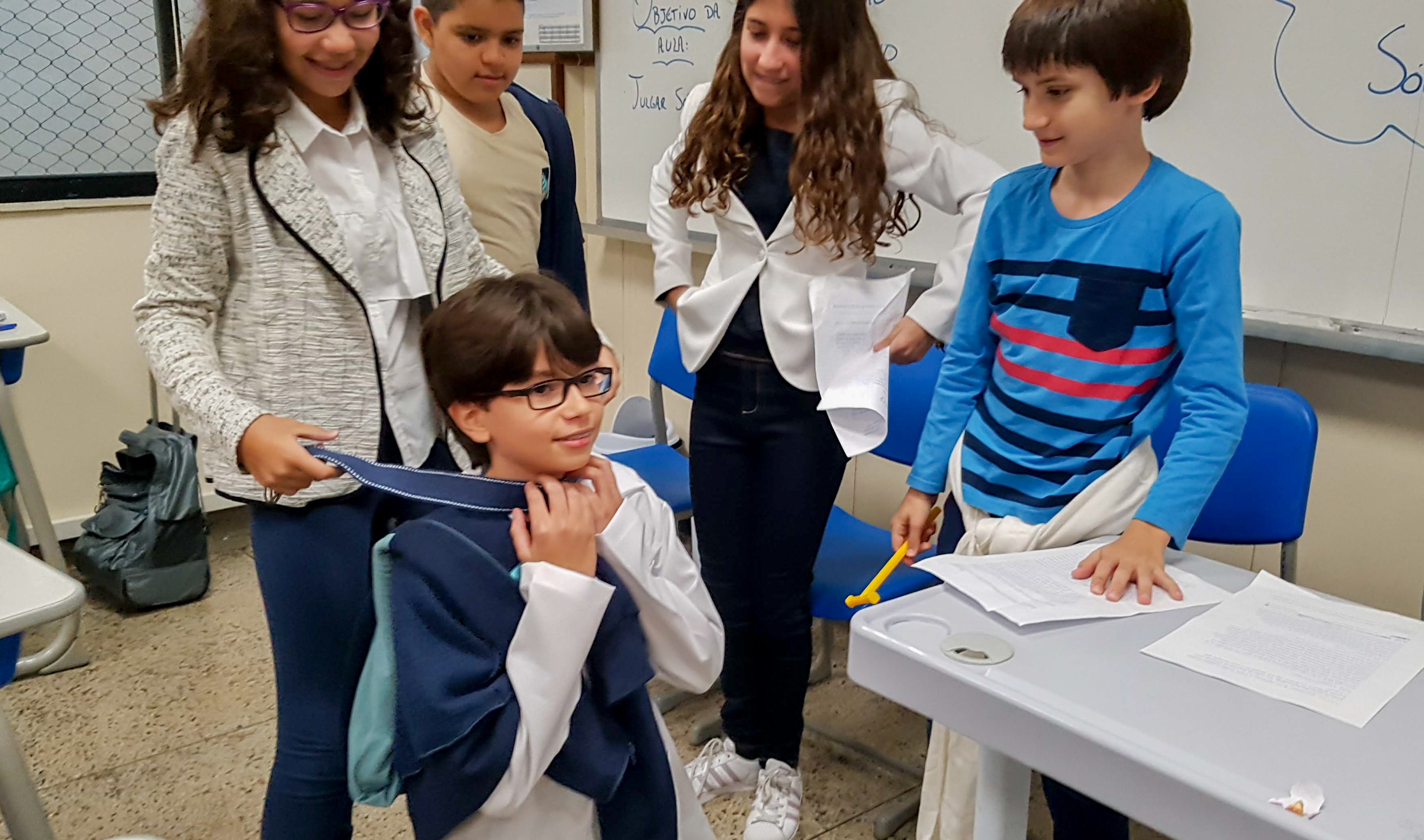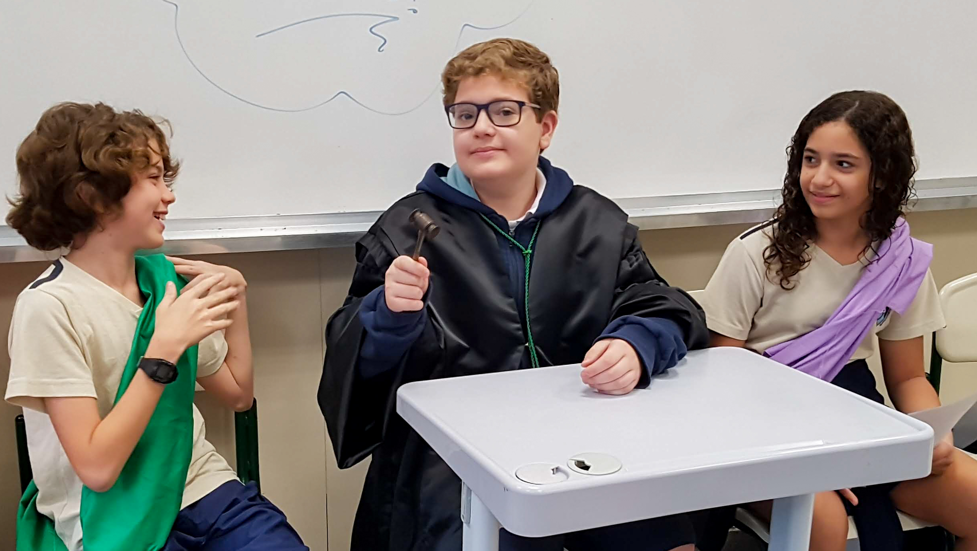 “Declaro aberto o julgamento de Sócrates”. Assim começou a apresentação de um dos grupos nas aulas de Cidadania e Salvaguarda. O conceito de democracia e o julgamento mais famoso da Grécia Antiga foram pauta de debate para os alunos do 6º ano do Ensino Fundamental. A proposta da professora Priscila Aquino foi que os alunos estudassem os personagens do julgamento e elaborassem um roteiro para simulação. Caracterizados e com as falas na ponta da língua, as turmas modificaram e atualizaram a história e os personagens em uma atividade lúdica e criativa repleta de aprendizado.