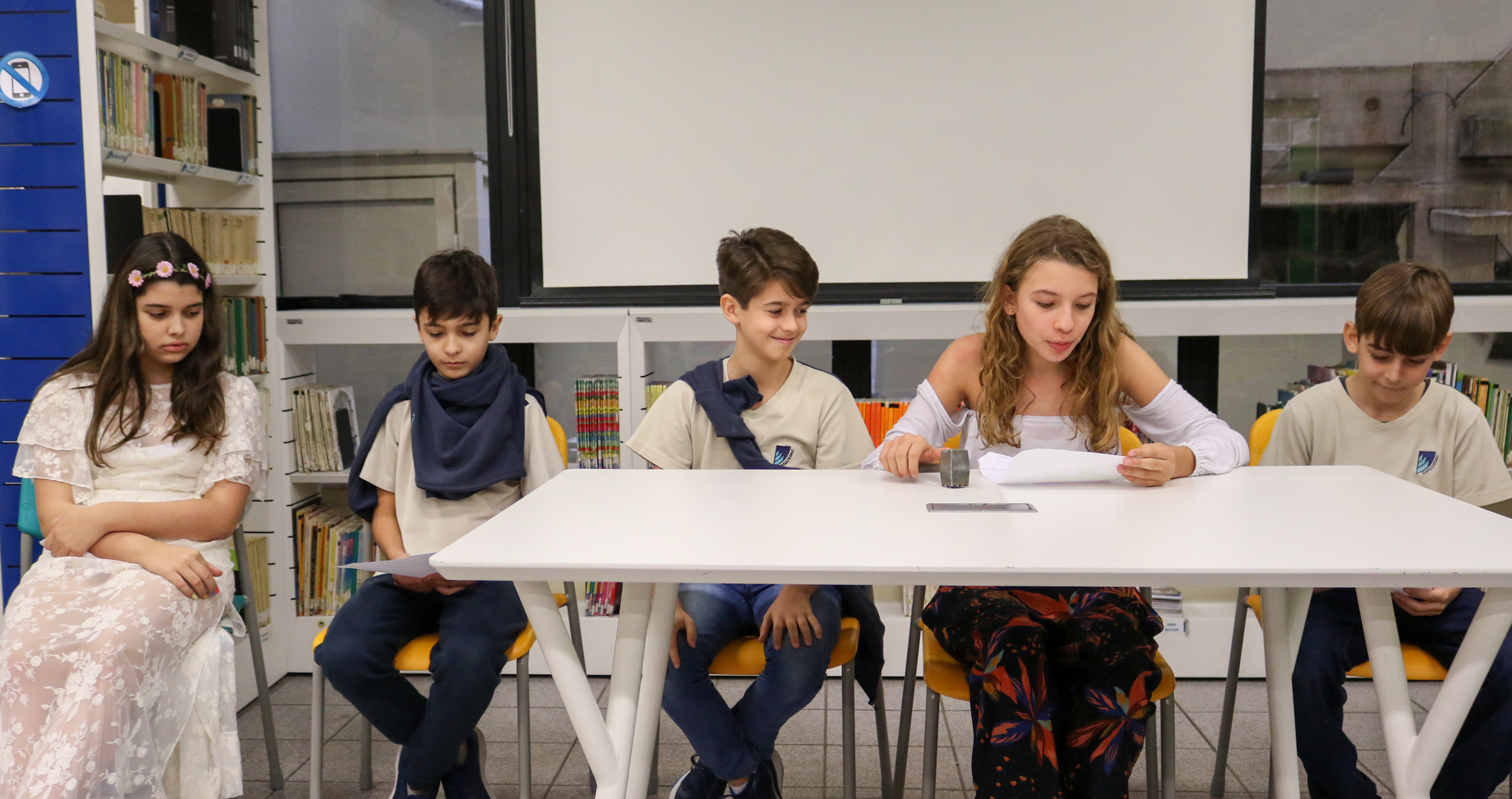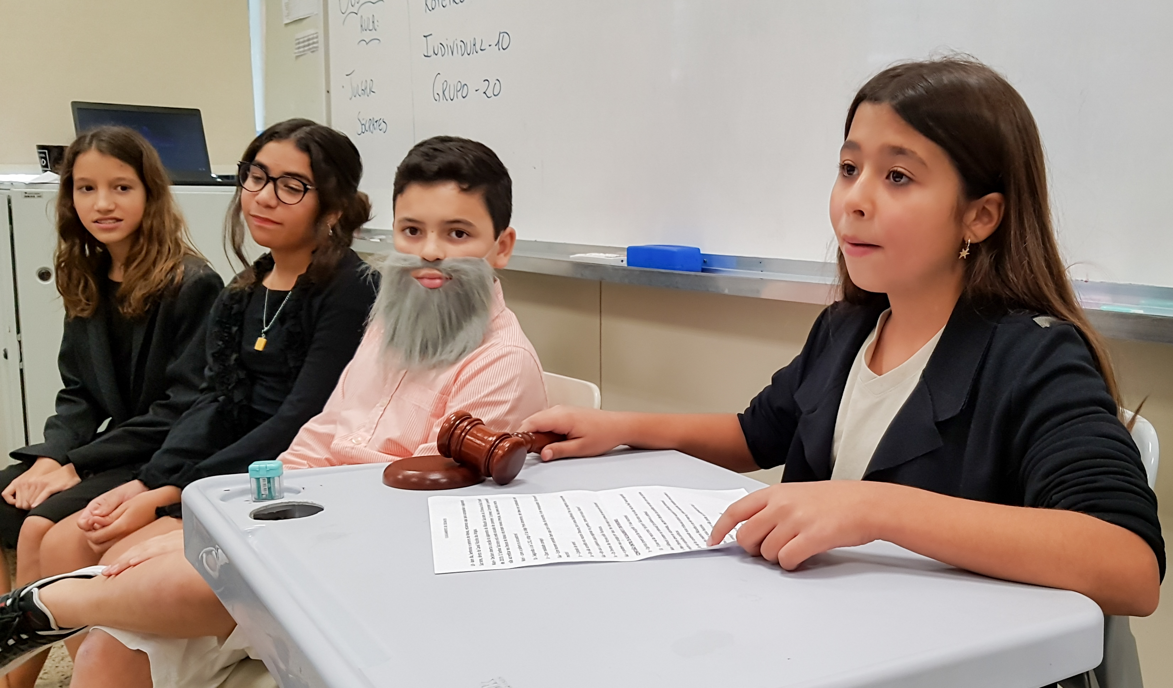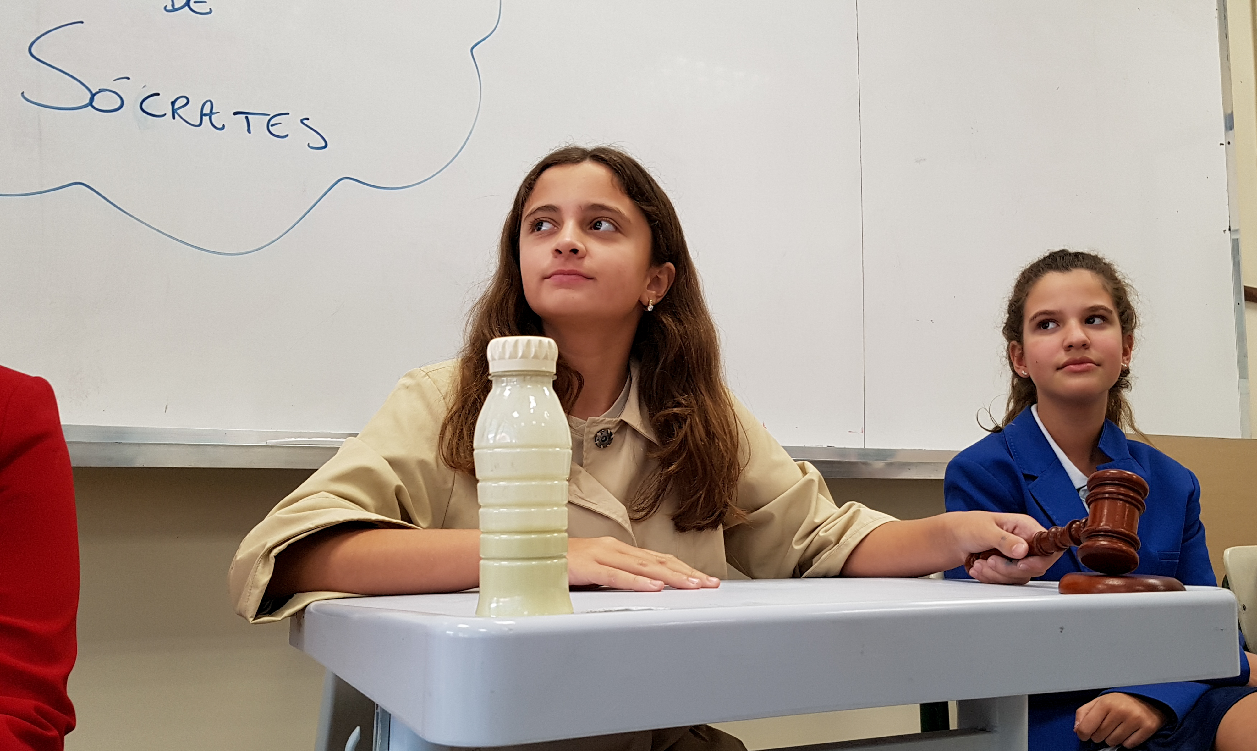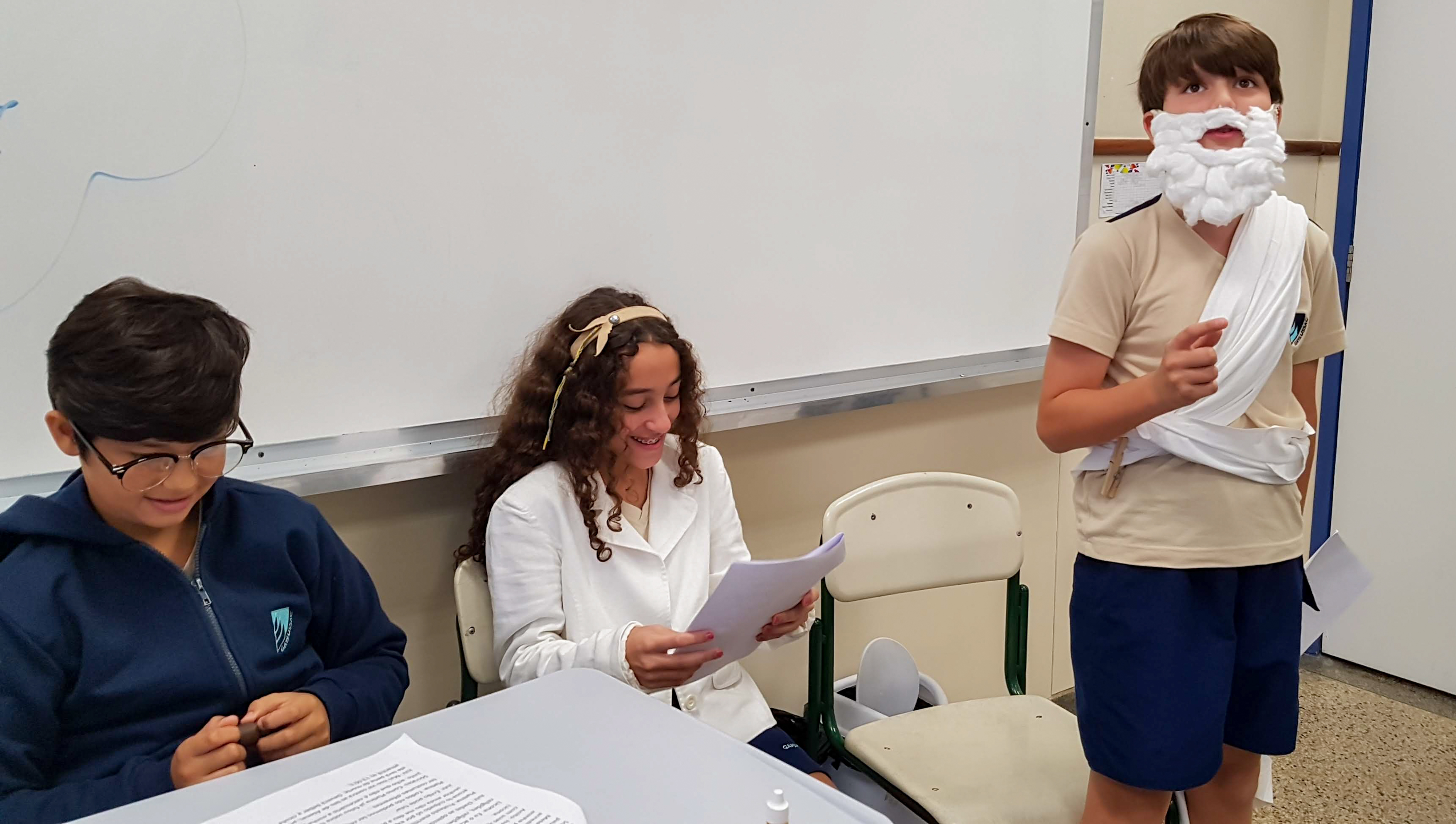 “Declaro aberto o julgamento de Sócrates”. Assim começou a apresentação de um dos grupos nas aulas de Cidadania e Salvaguarda. O conceito de democracia e o julgamento mais famoso da Grécia Antiga foram pauta de debate para os alunos do 6º ano do Ensino Fundamental. A proposta da professora Priscila Aquino foi que os alunos estudassem os personagens do julgamento e elaborassem um roteiro para simulação. Caracterizados e com as falas na ponta da língua, as turmas modificaram e atualizaram a história e os personagens em uma atividade lúdica e criativa repleta de aprendizado.