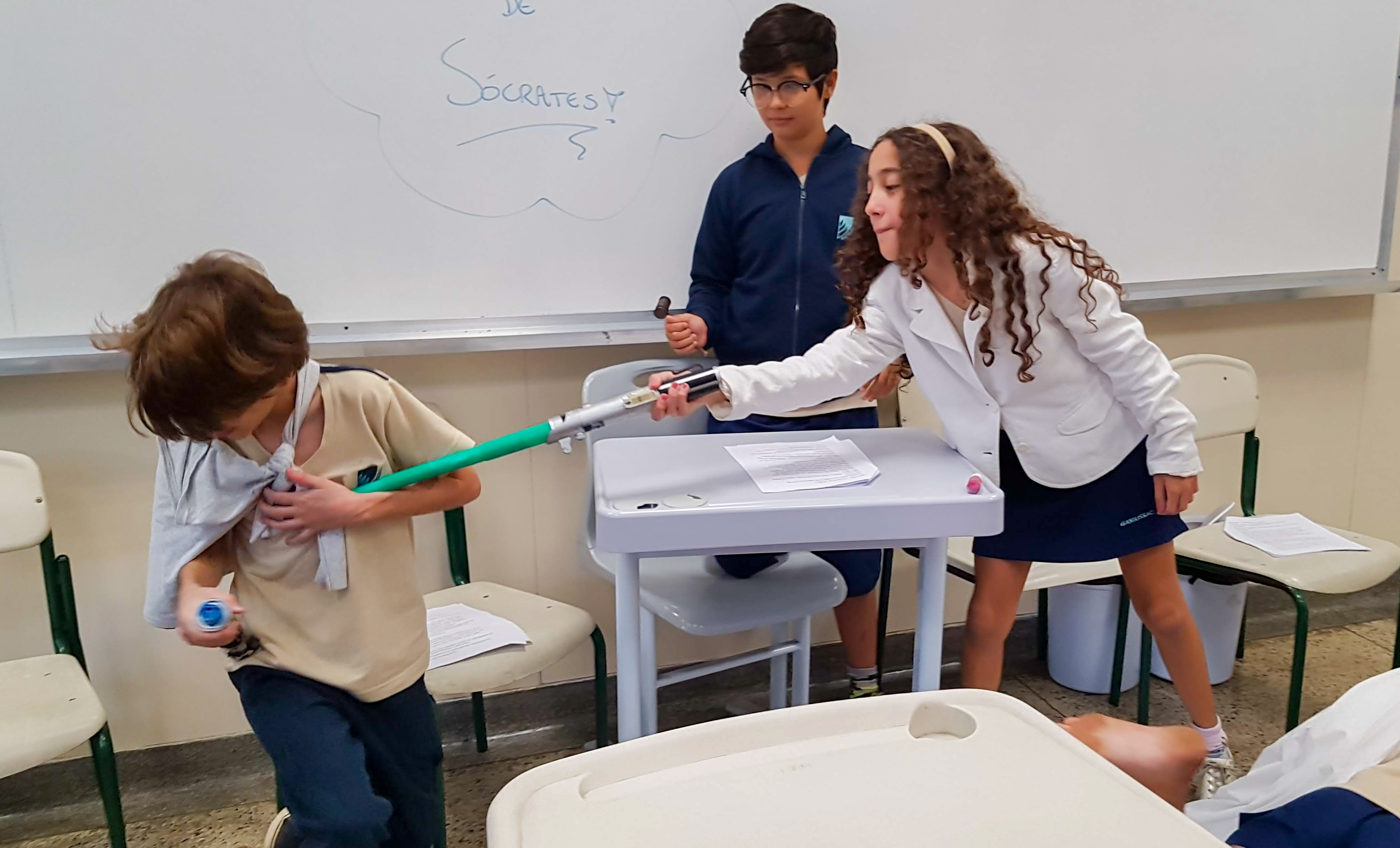 Cada grupo poderia montar um final diferente. Duelos de espadas substituíram o veneno da cicuta, em algumas ocasiões. Sócrates sobreviveu e matou o acusador Meleto, em outras. O aluno Victor Loougon explica: “Eu acho errado o que a cidade de Atenas fez com Sócrates, pois cada um tem o direito de pensar e falar o que pensa, desde que não seja agressivo com o outro”. A aluna Lívia Nery reflete: “Acho um erro, pois cada um pensa de um jeito e temos que respeitar o pensamento do outro”.