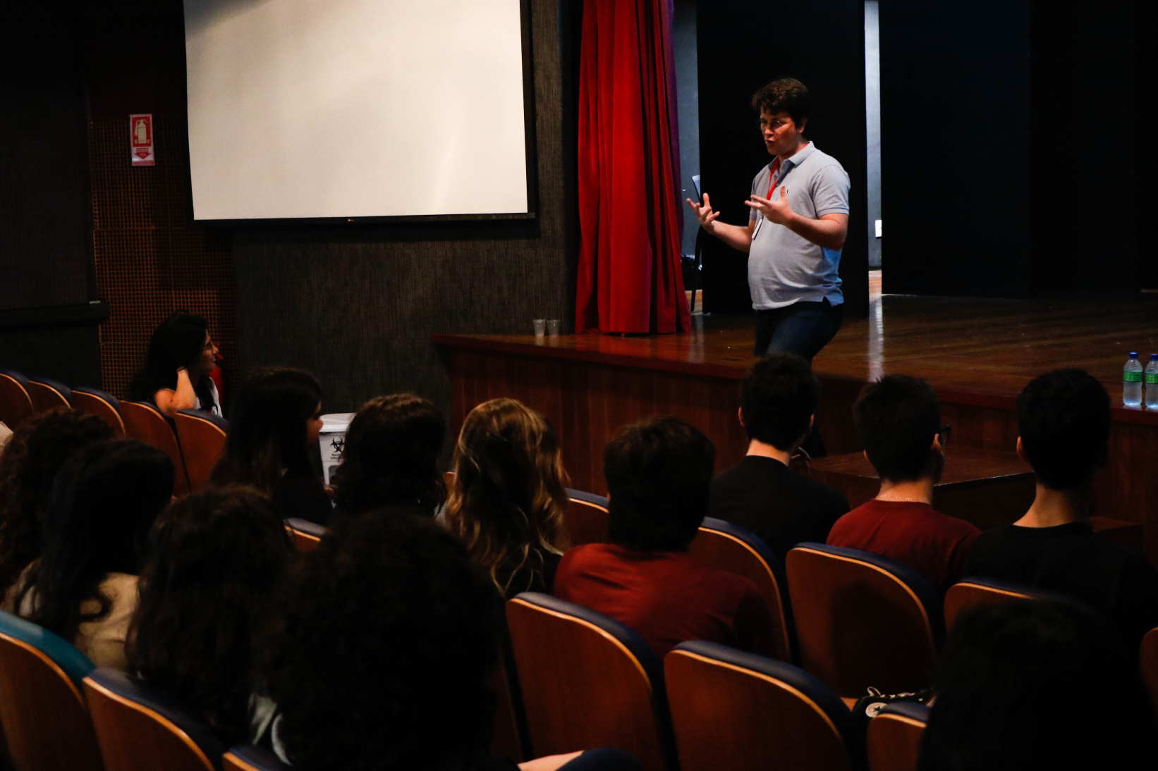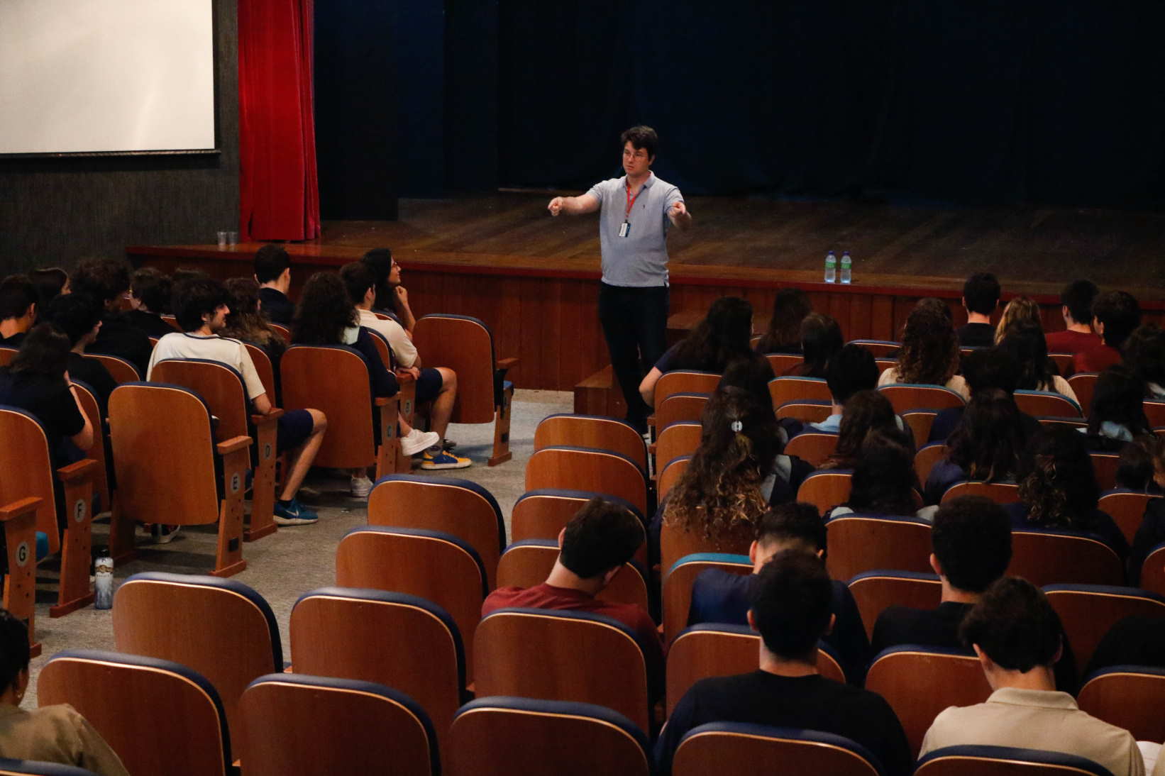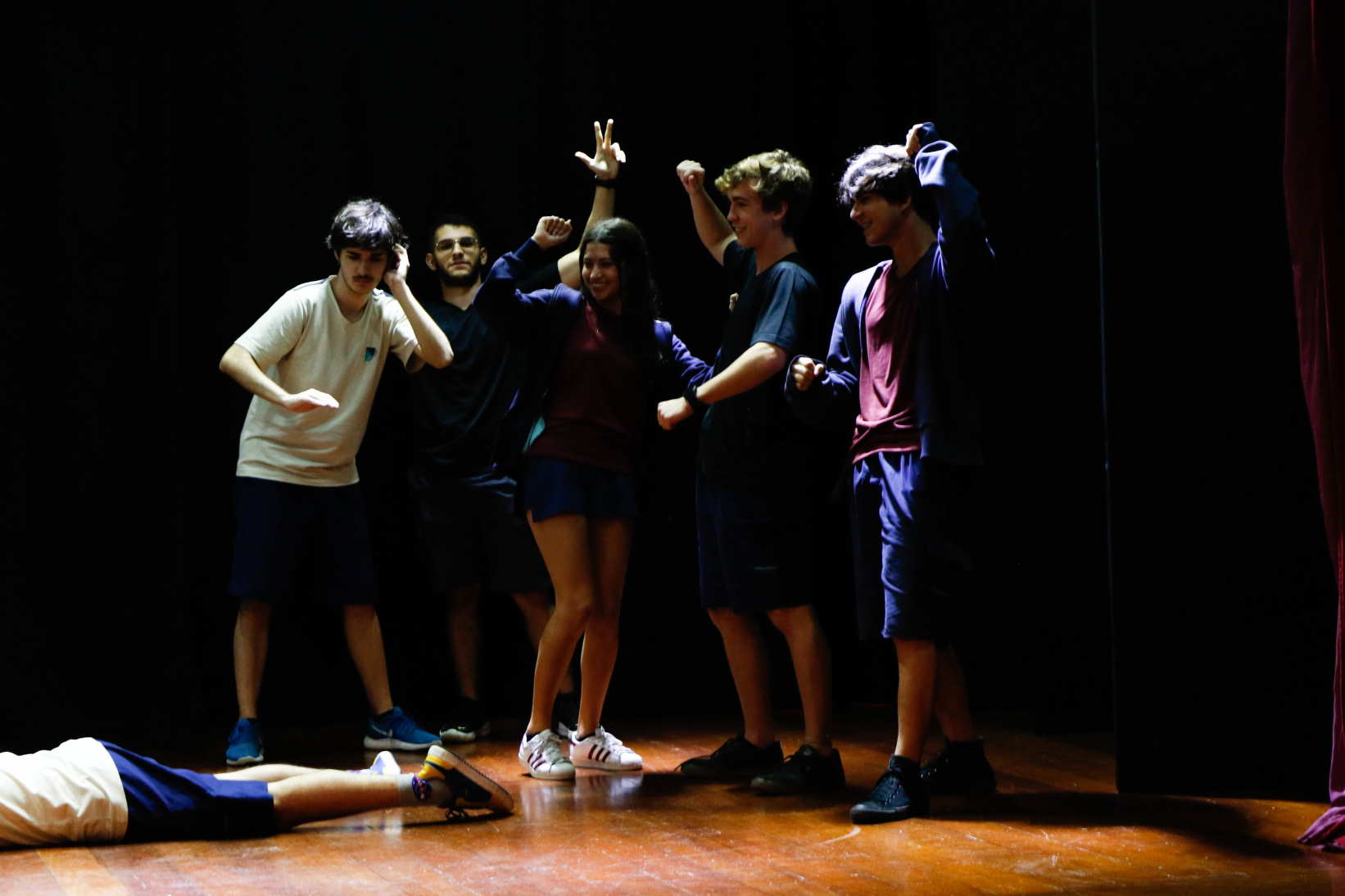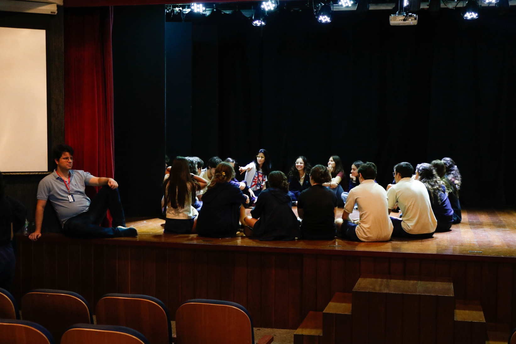 A 3ª série do Ensino Médio participou de uma aula interdisciplinar sobre a história do teatro, organizada pelos professores Milena Matta, de Música, Deborah Boechat, de Artes Visuais, Bruna Scavuzzi, de Teatro, e Frederico Jardim, de Sociologia. O foco do encontro foram os movimentos teatrais no Brasil, sobretudo o Teatro do Oprimido, método criado e sistematizado pelo teatrólogo e professor Augusto Boal.