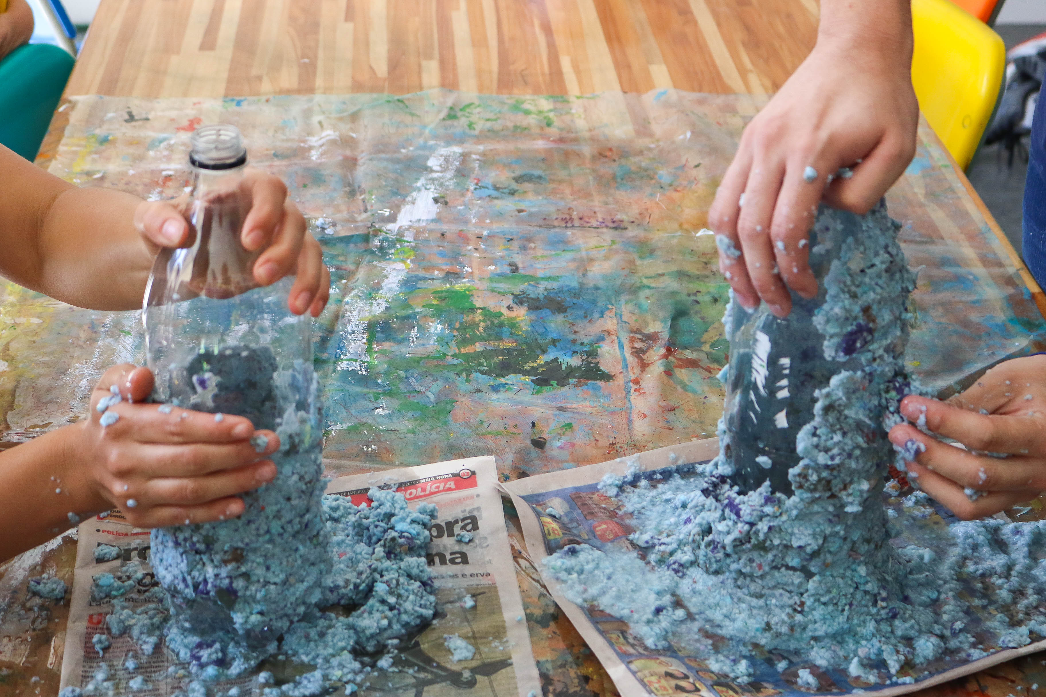 A partir da observação do troféu de campeão mundial entregue na Copa de 1930, e da nova versão da taça em 2019, os alunos construíram a sua própria versão do prêmio, que contou com papel reciclável, água e tinta guache. A turma conta: “There is an angel or a woman. She is holding a giant bowl. The base is blue. It’s made of gold. It’s beautiful! There is a soccer ball and the middle is like a spiral. The base is green. It’s made of gold and silver. It’s more beautiful than the old one. We made a world cup trophy and a Copa America trophy!”
