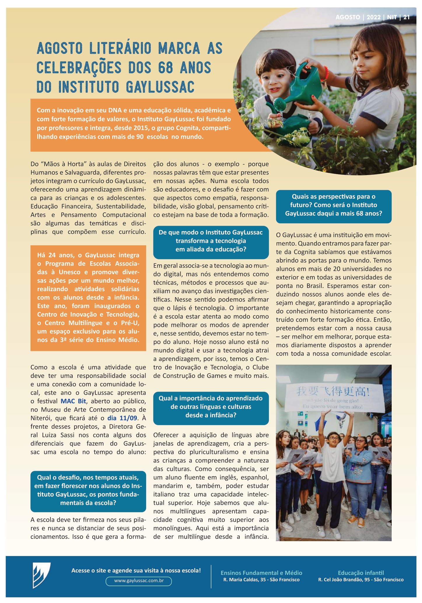 Agosto Literário marca as celebrações dos 68 anos do Instituto GayLussac